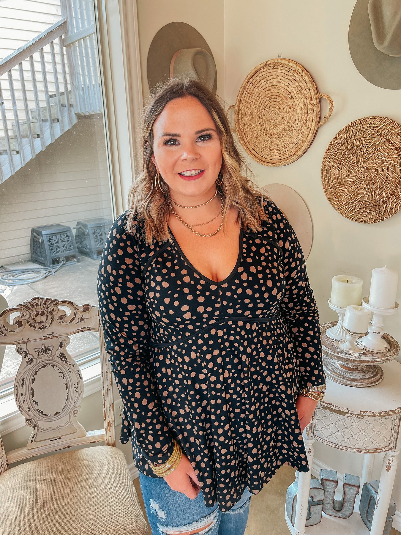 Last Chance Size Small & Medium | She's A Doll Long Sleeve Taupe Dotted Babydoll Top with V Neckline in Black
