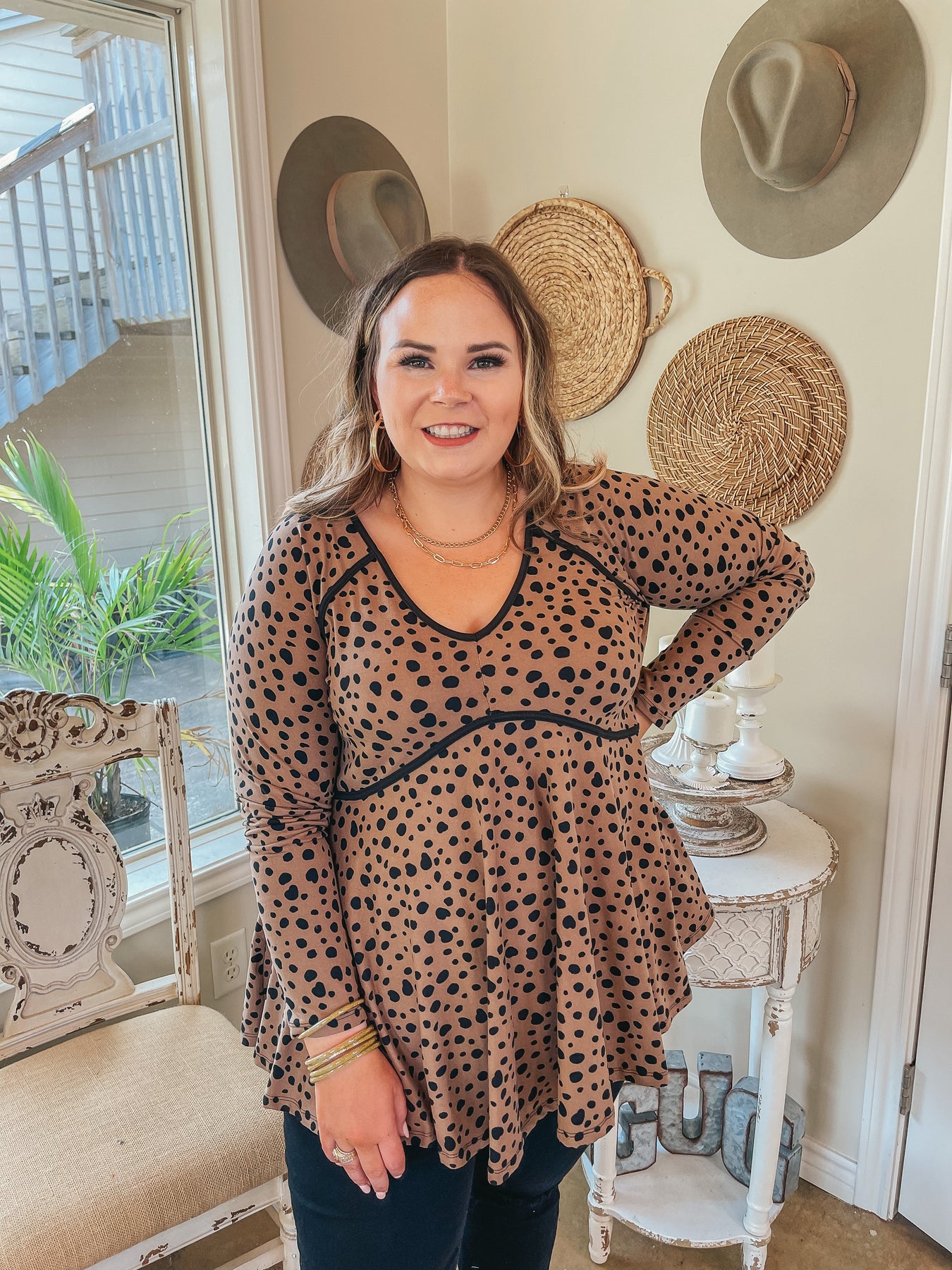 She's A Doll Long Sleeve Dotted Babydoll Top with V Neckline in Brown