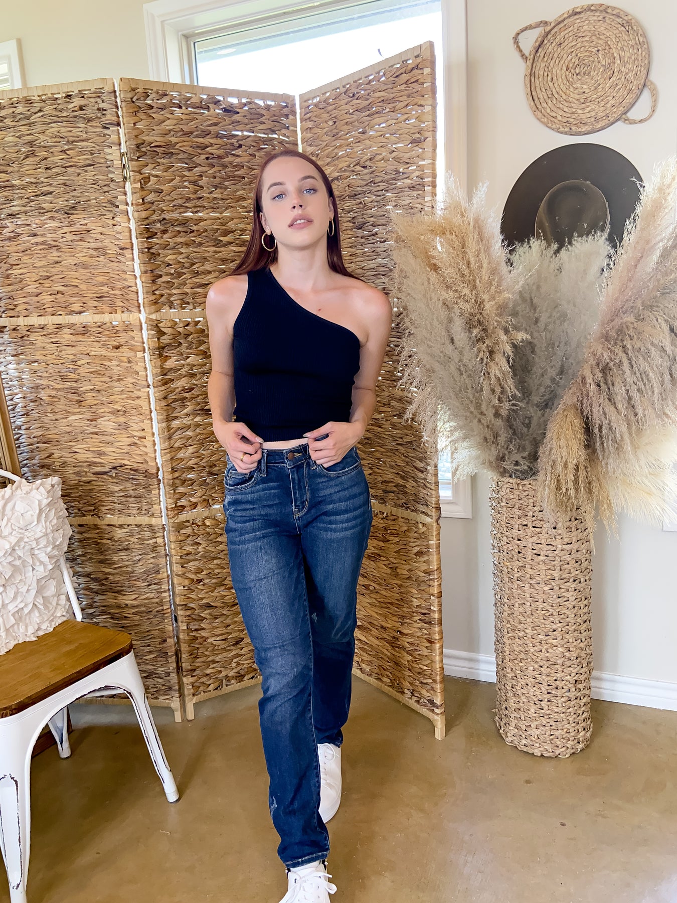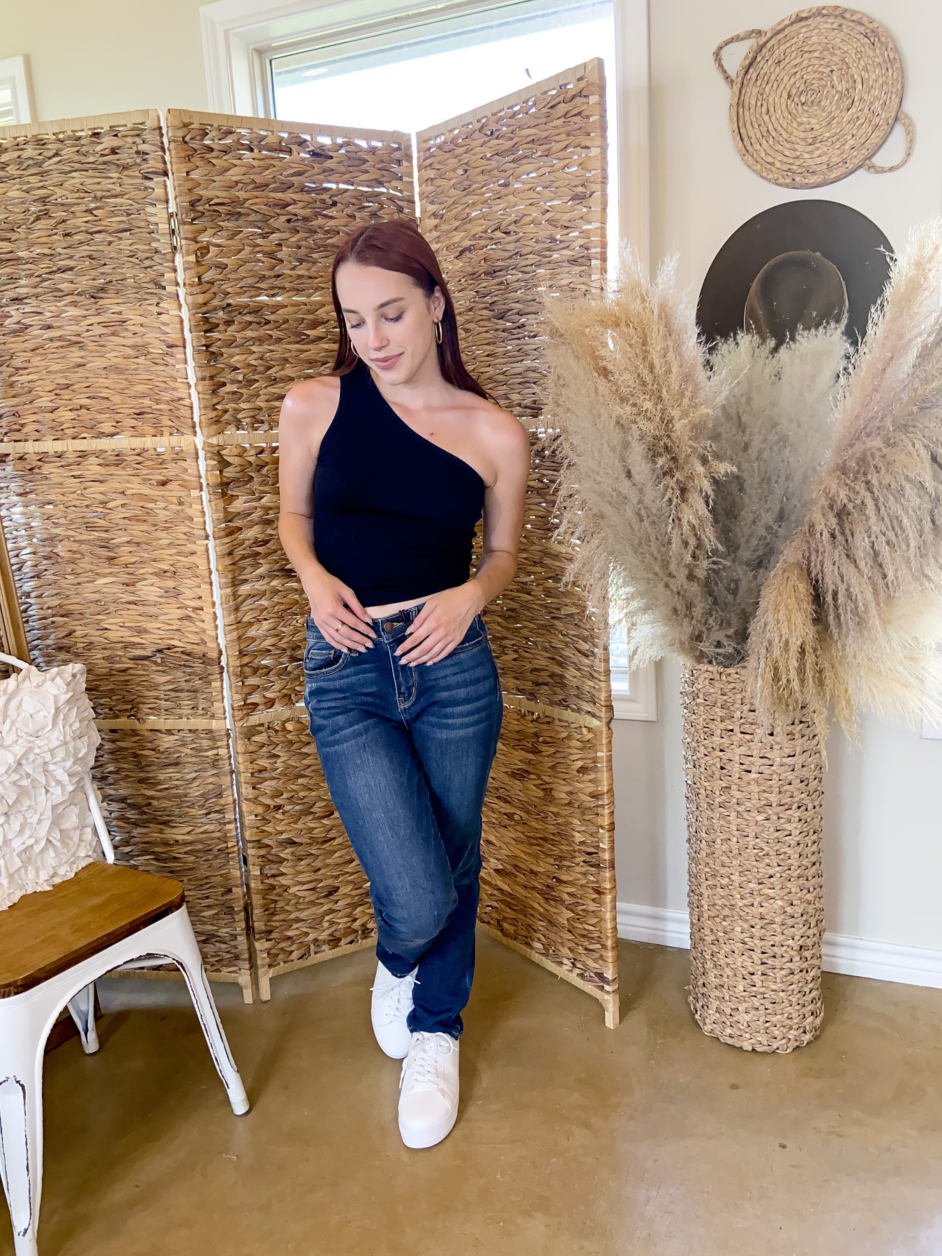 From the gym, to the couch, to a night on the town, this top is the perfect piece for you! It includes a one shoulder, ribbed material, and lots of stretch! We are obsessed with the stylish comfort that these tops offer.