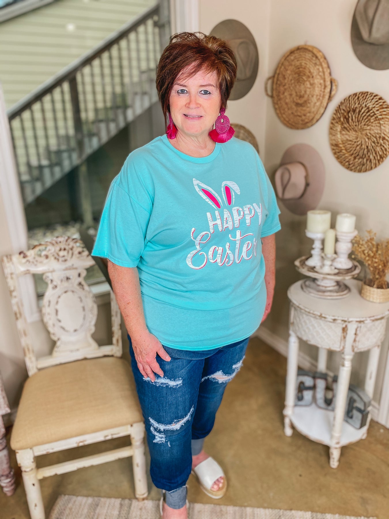 Last Chance Size Small & 3XL | Happy Easter Bunny Ears Graphic Tee in Neon Mint