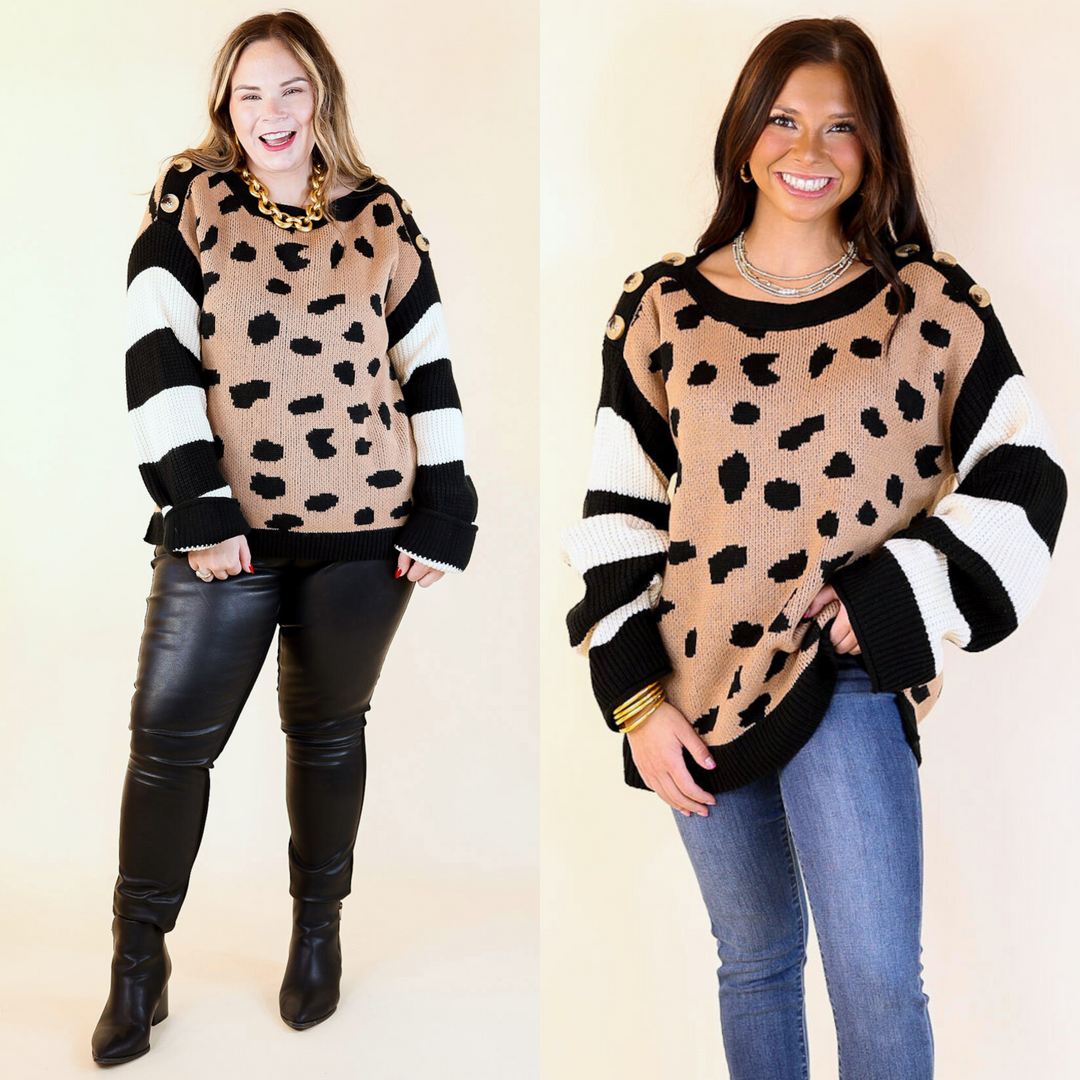 Spotted in Aspen Dotted Sweater with Striped Sleeves and Buttons in Mocha and Ivory