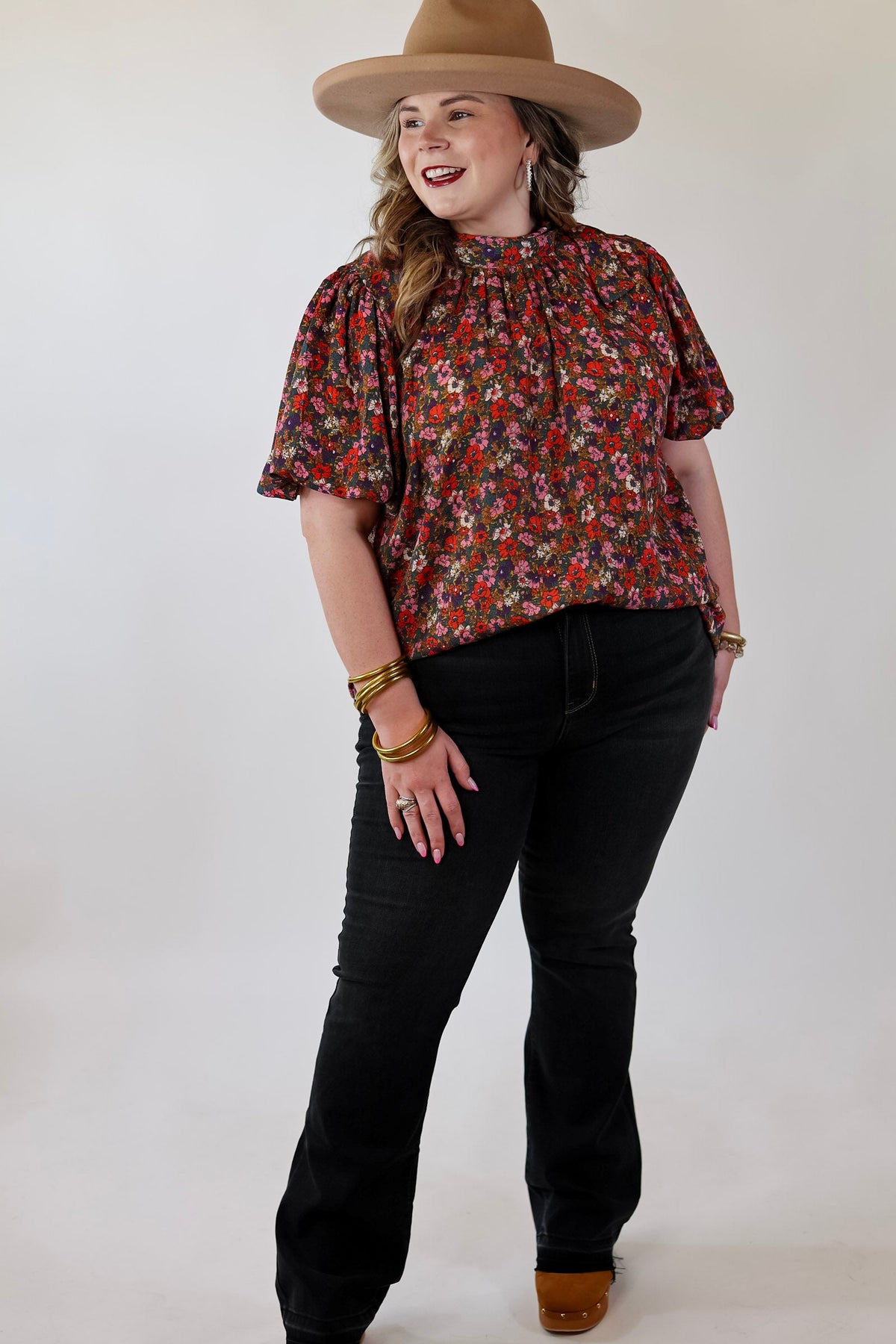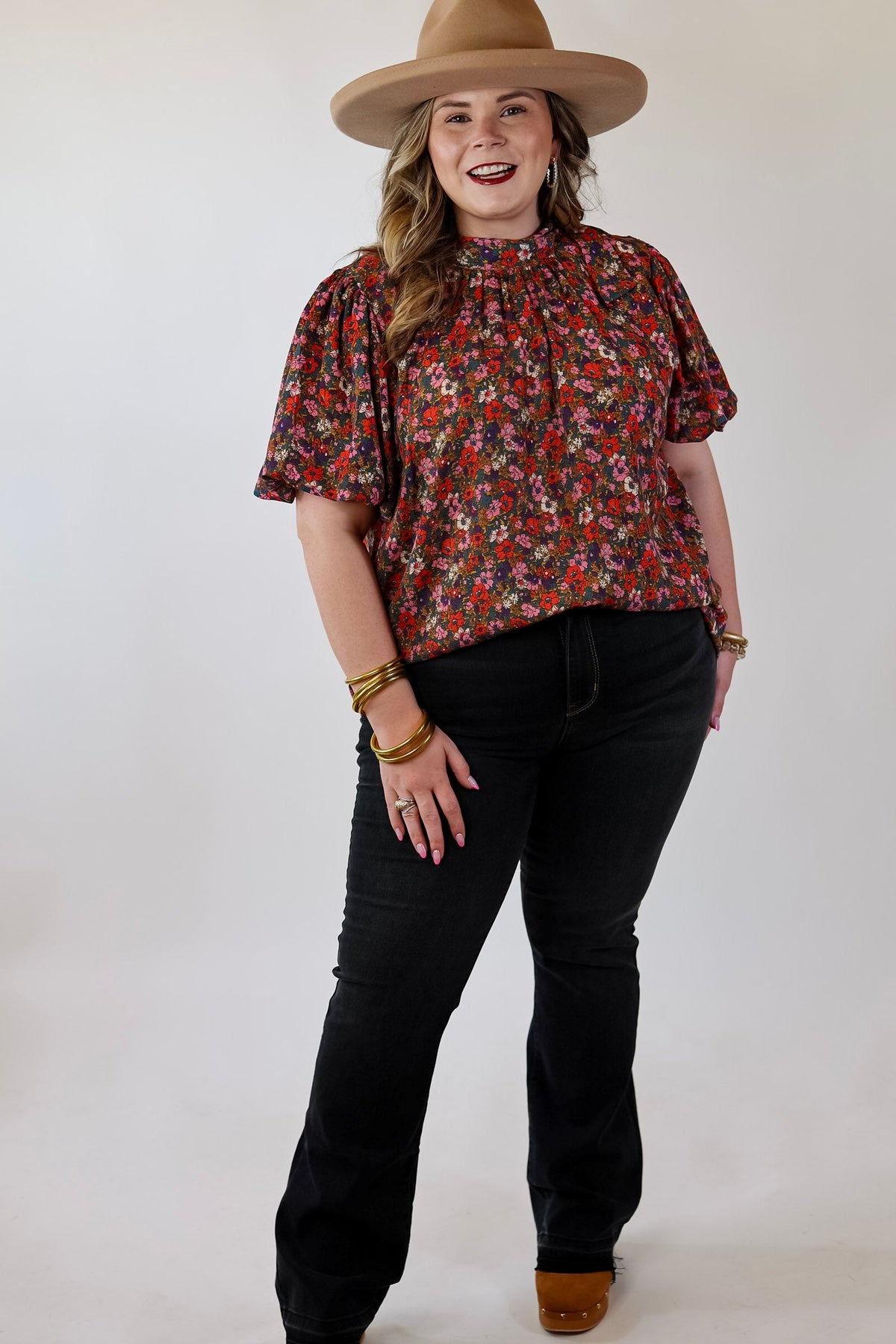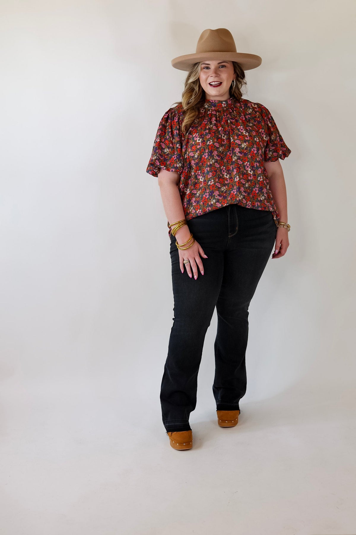 This new top will make sure you are Devine all day! It includes short balloon sleeves, a mock neckline that ties in the back, and a cute floral print that is perfect for Fall. Pair it with wedges and Judy Blue jeans and you'll be set for the season! Abby is wearing a size large.
