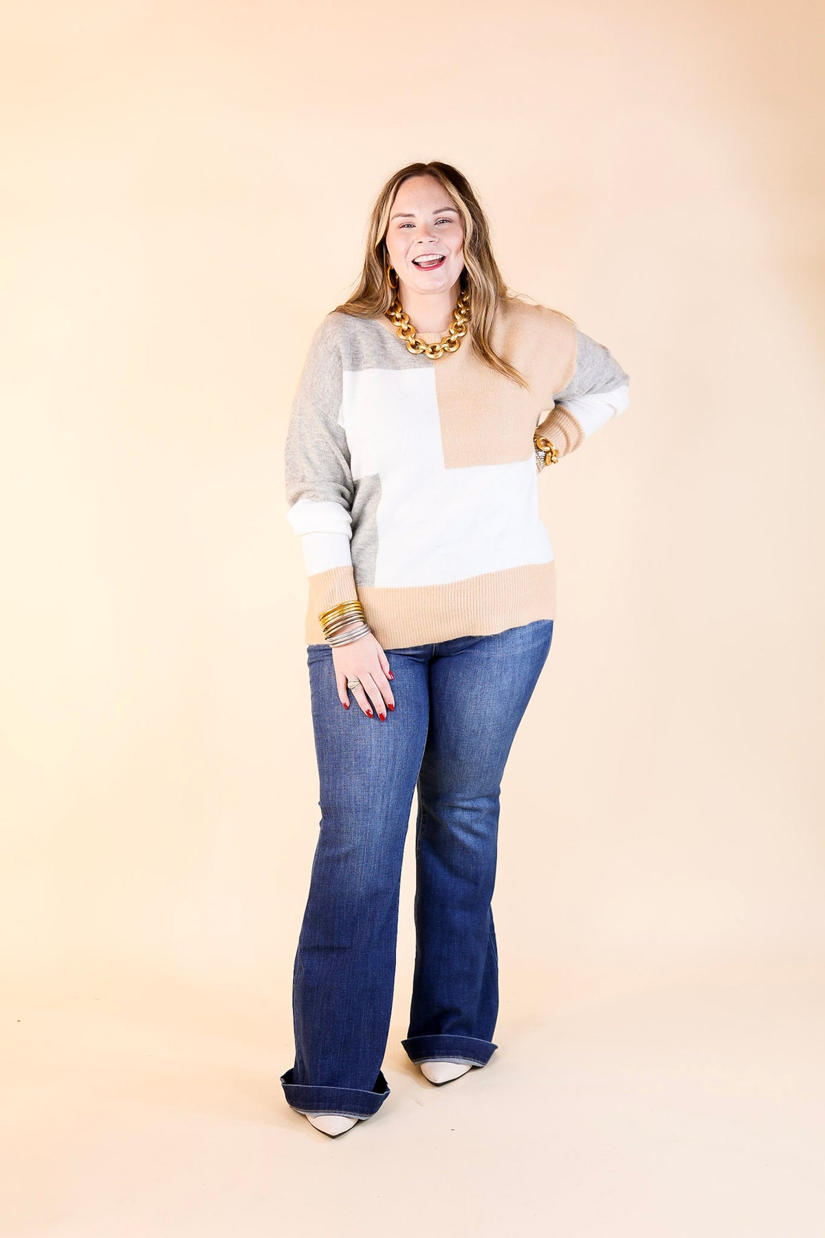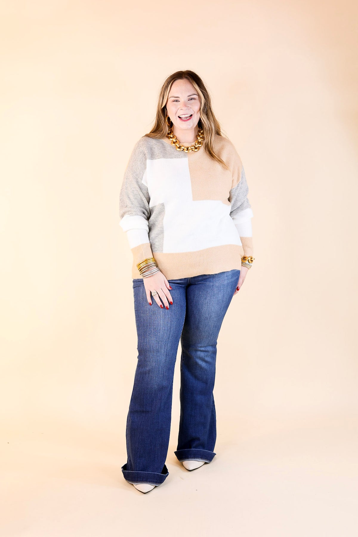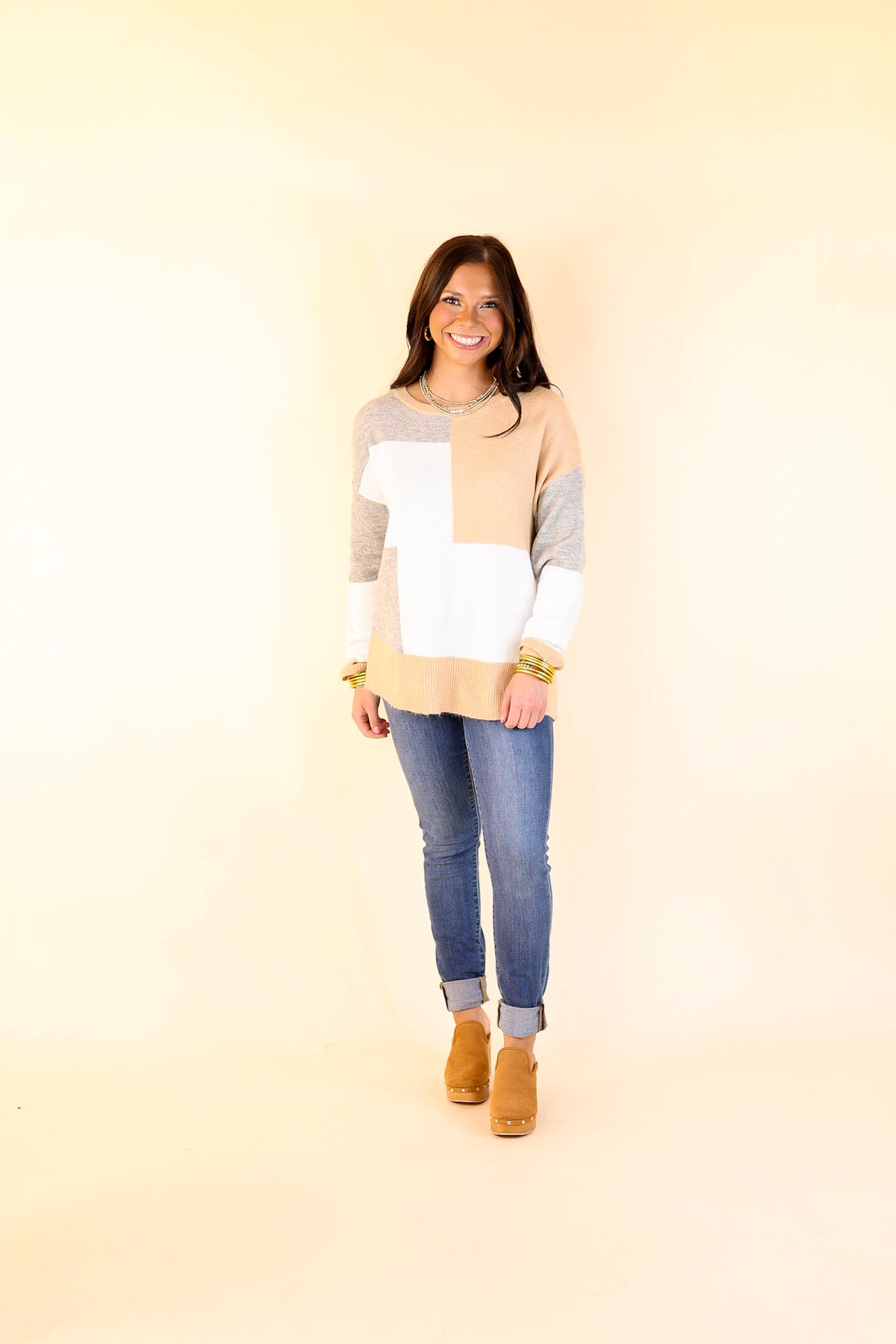 Frozen Lake Color Block Sweater in Ivory, Tan, and Grey