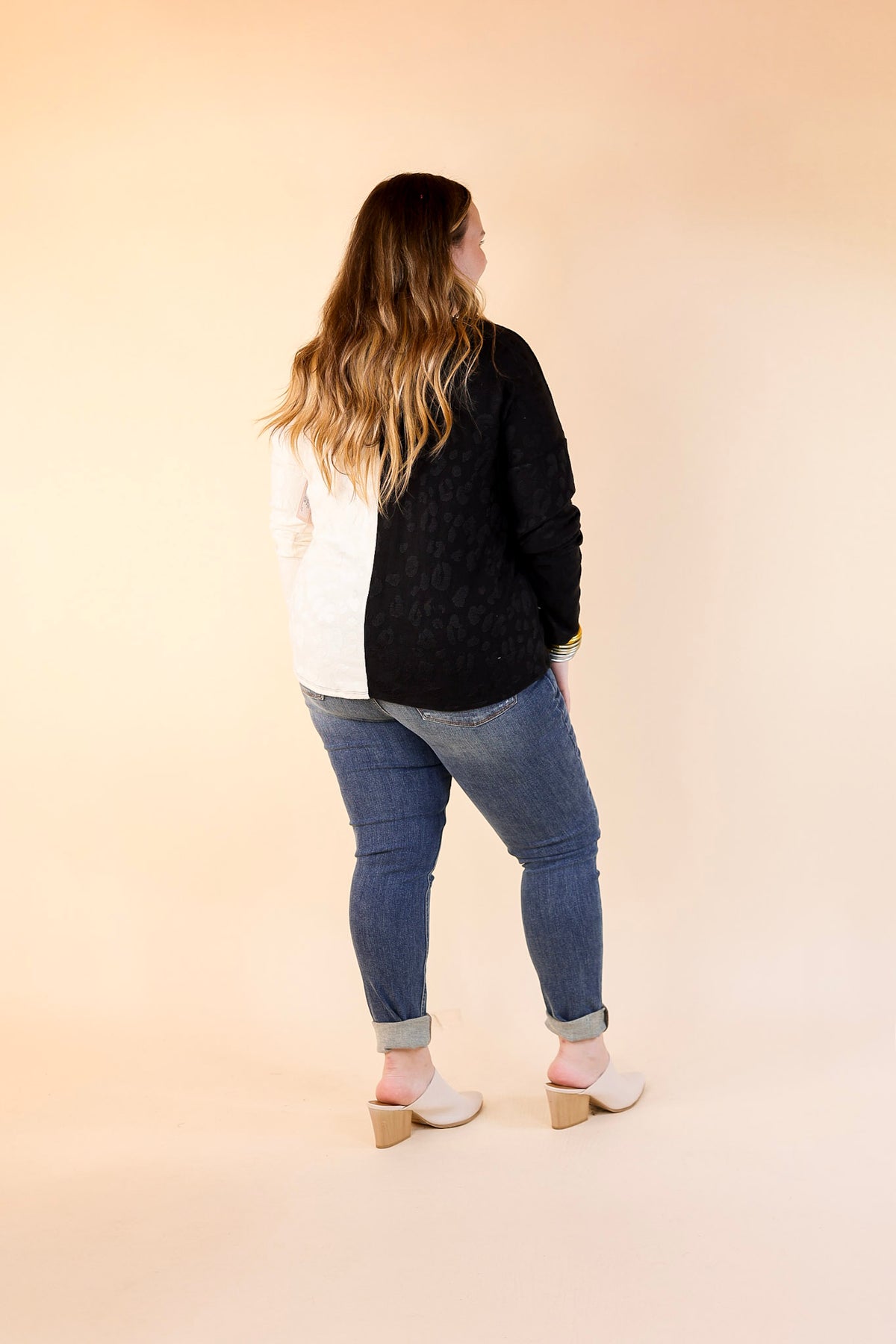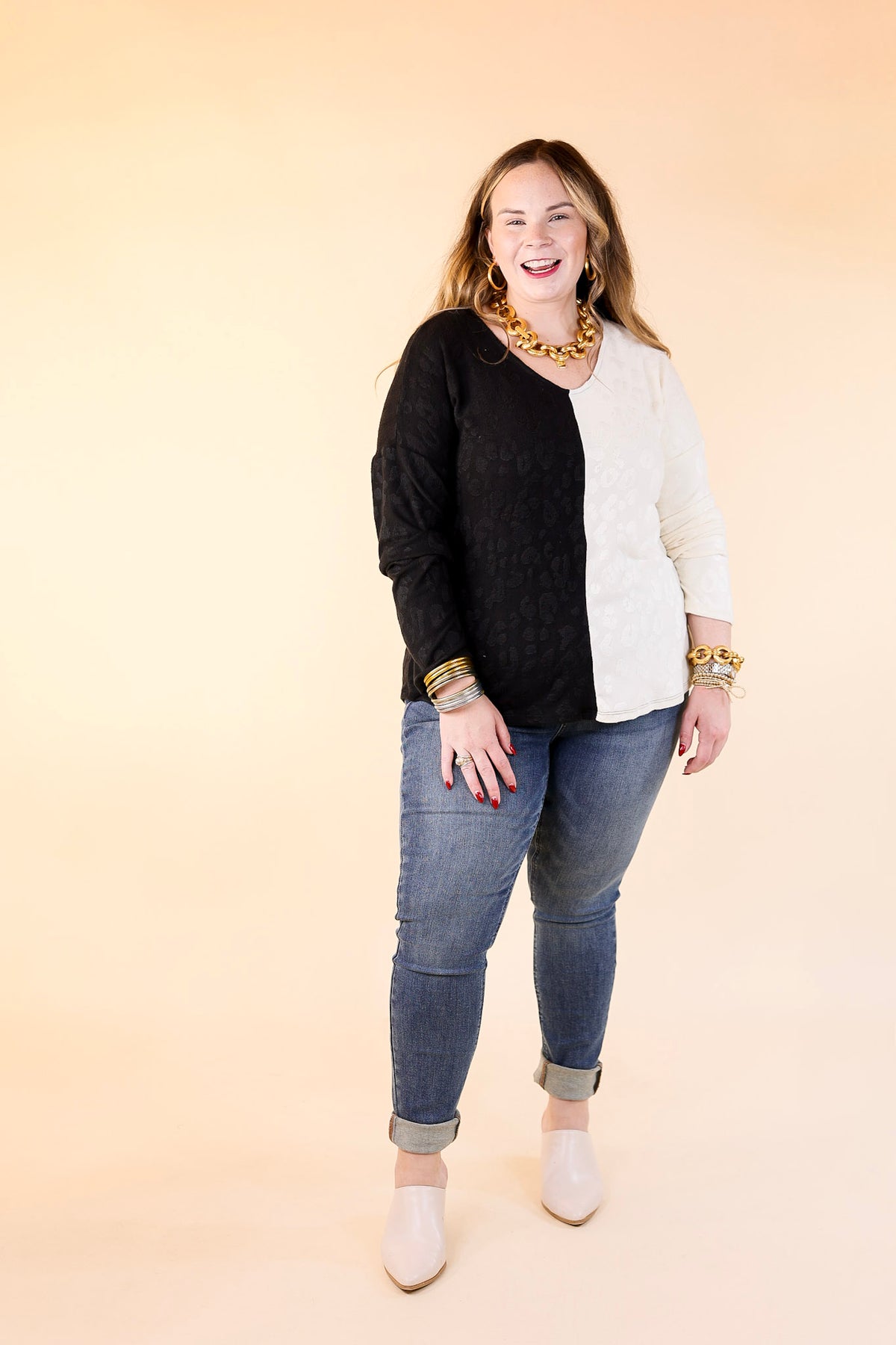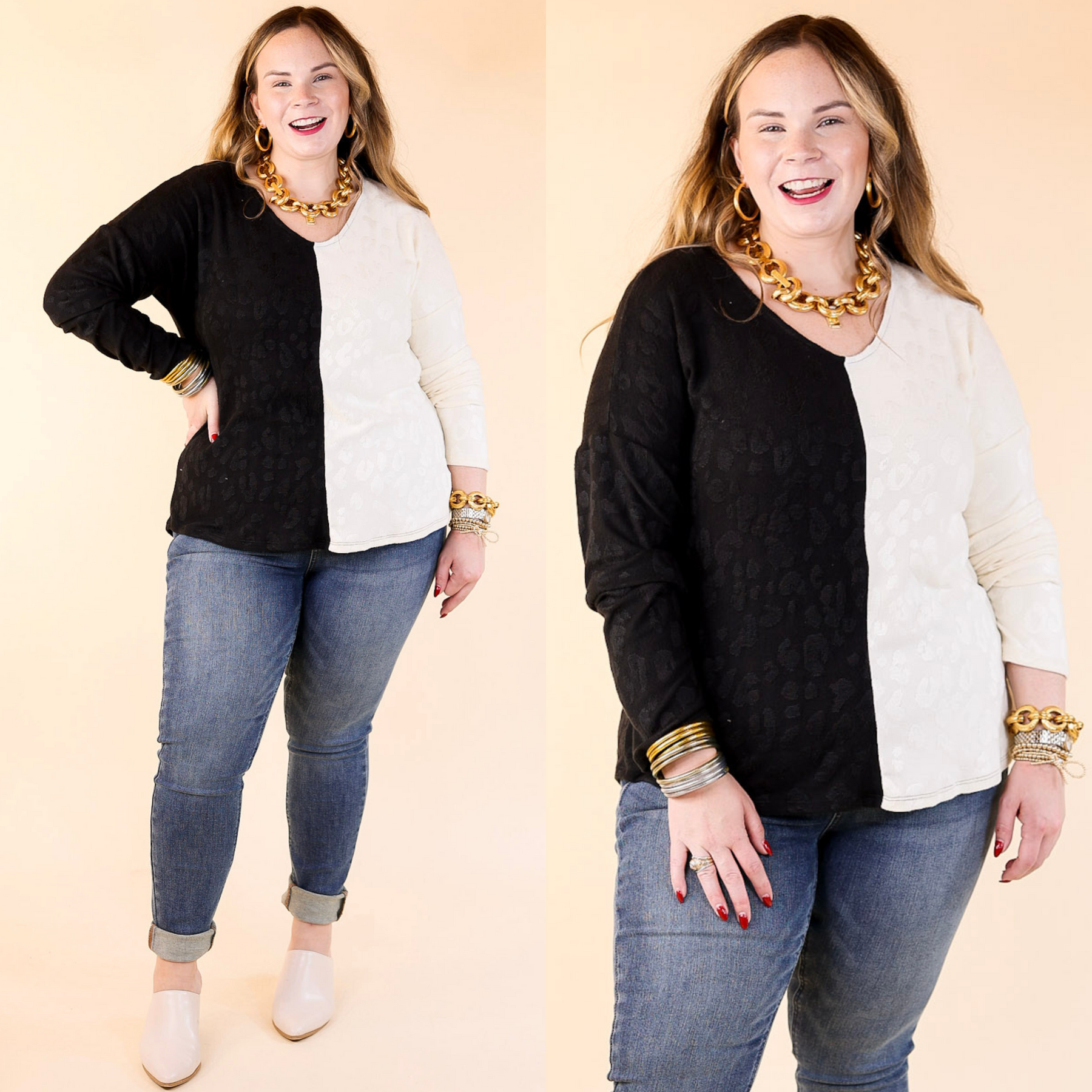 The sight of this new sweater is unbeatable! It includes a leopard print all over, a v neckline, long sleeves, and a half black, half ivory body. Pair this with skinny jeans and booties for a cute look!
