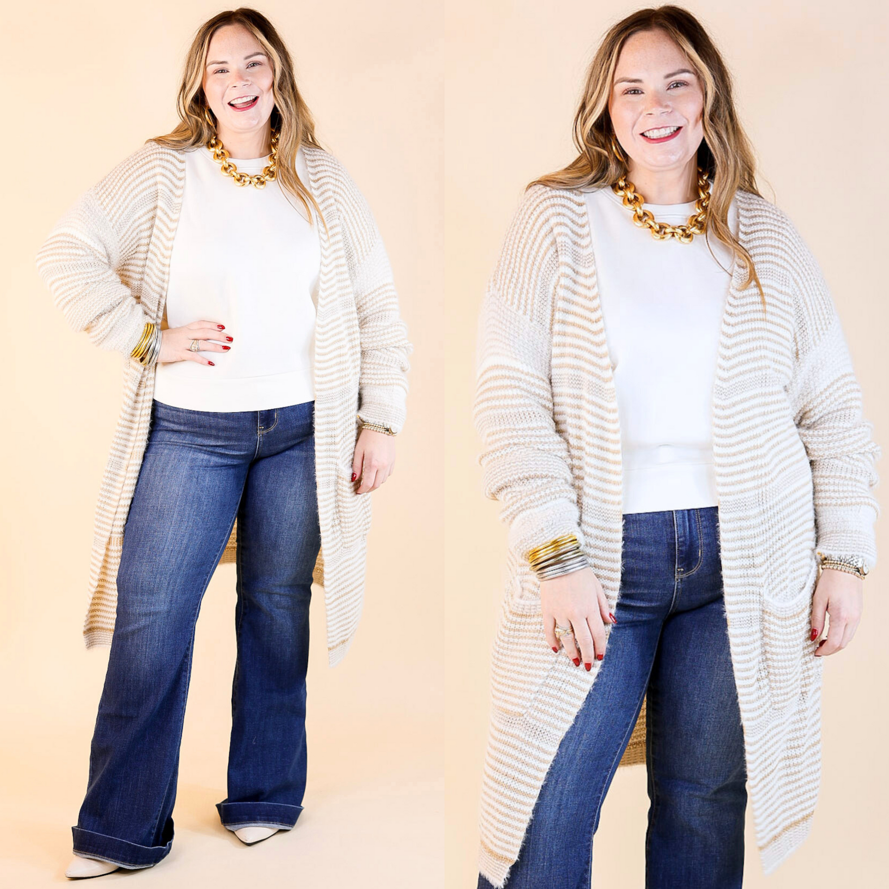 Upstate Chill Striped Knit Cardigan with Pockets in Beige