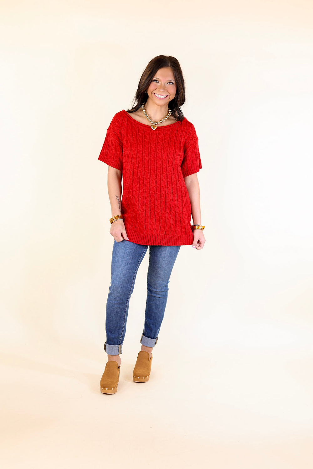 Day Date Short Sleeve Sweater with Scoop Neckline in Red