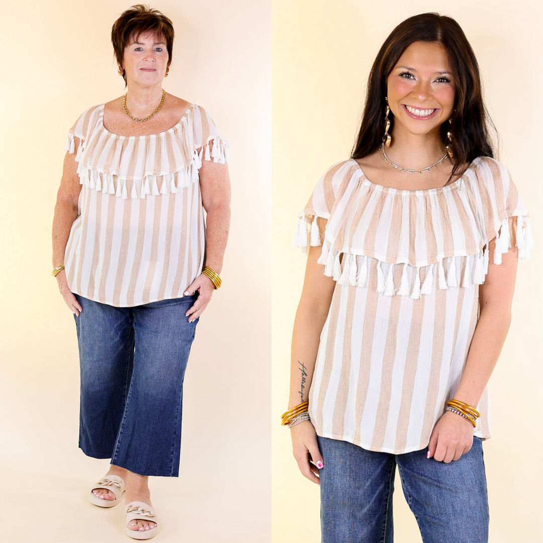 SoCal Sun Striped Off the Shoulder Top with Tassels in Ivory and Sand