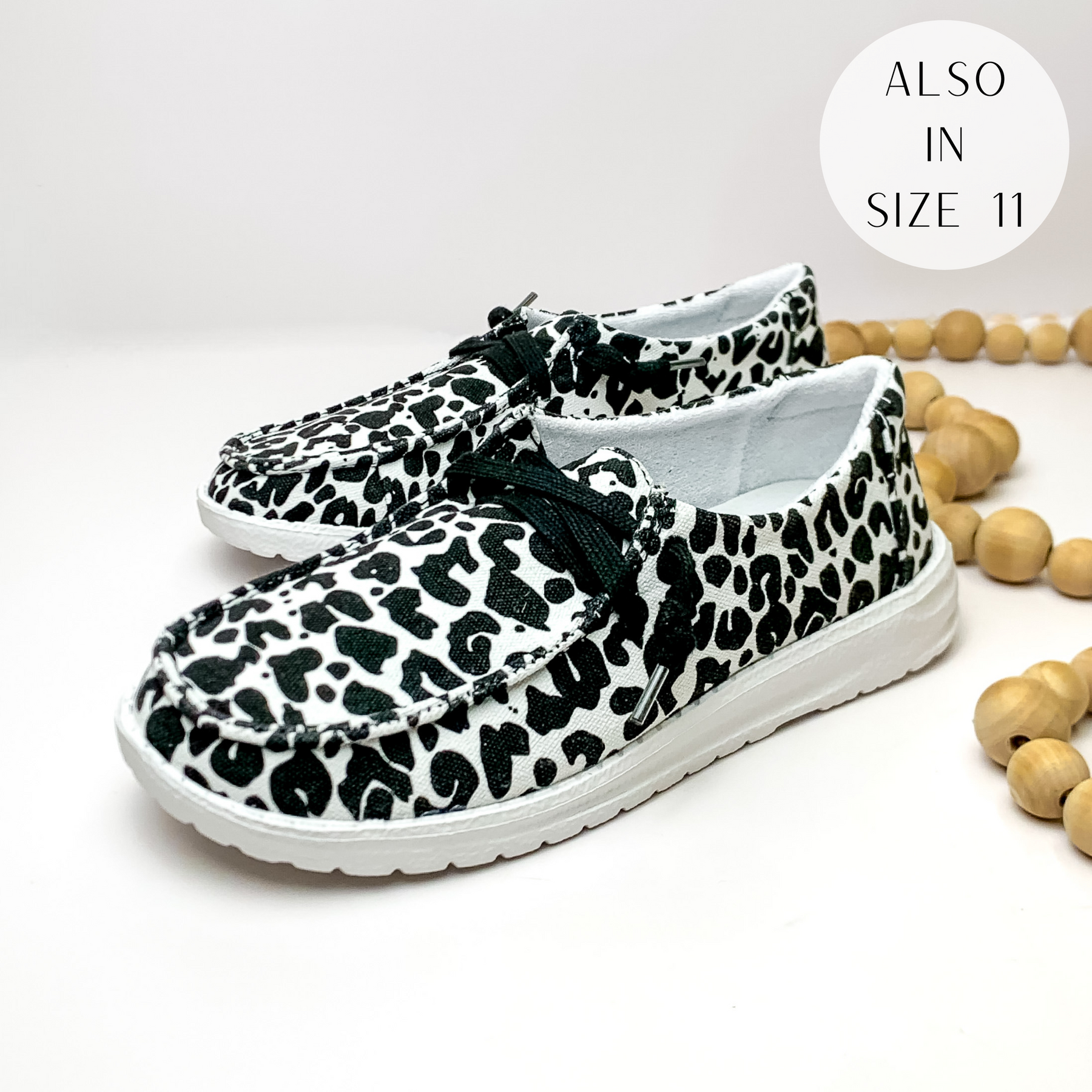 Pictured are a pair of black and white leopard print canvas shoes with a white sole and black laces. These shoes are pictured on a white background with tan beads on the right side.