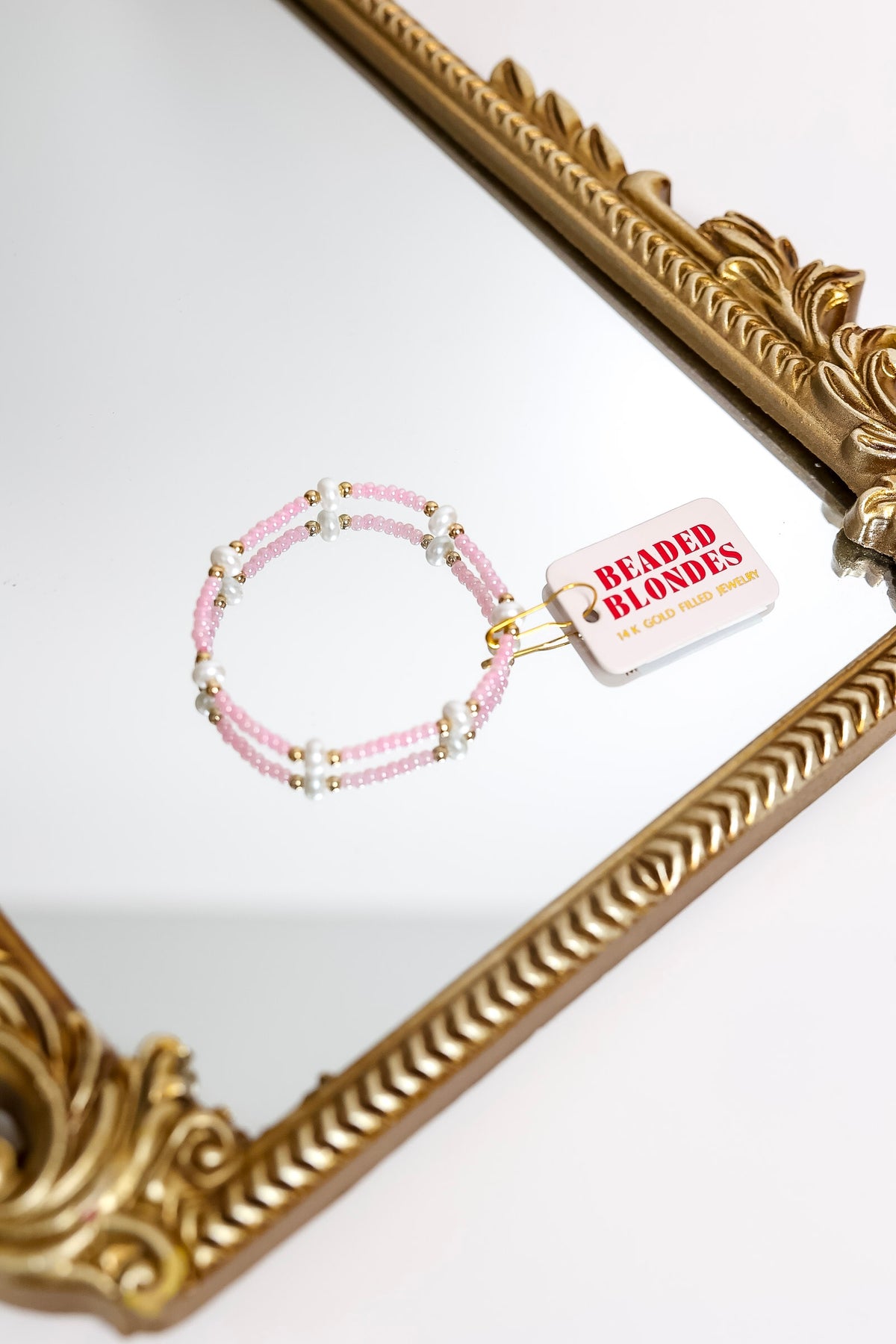 Introducing the Beaded Blondes Spring 2025 Collection. This stunning bracelet features delicate pink czech glass beads, 3mm beads and pearls, accented with pearl and gold spacers. Handstrung in College Station, Texas with 14K gold filled and elastic string, this piece is not only beautiful, but also durable - waterproof, workout proof, and tarnish proof. Experience the beauty and quality of this handcrafted piece.