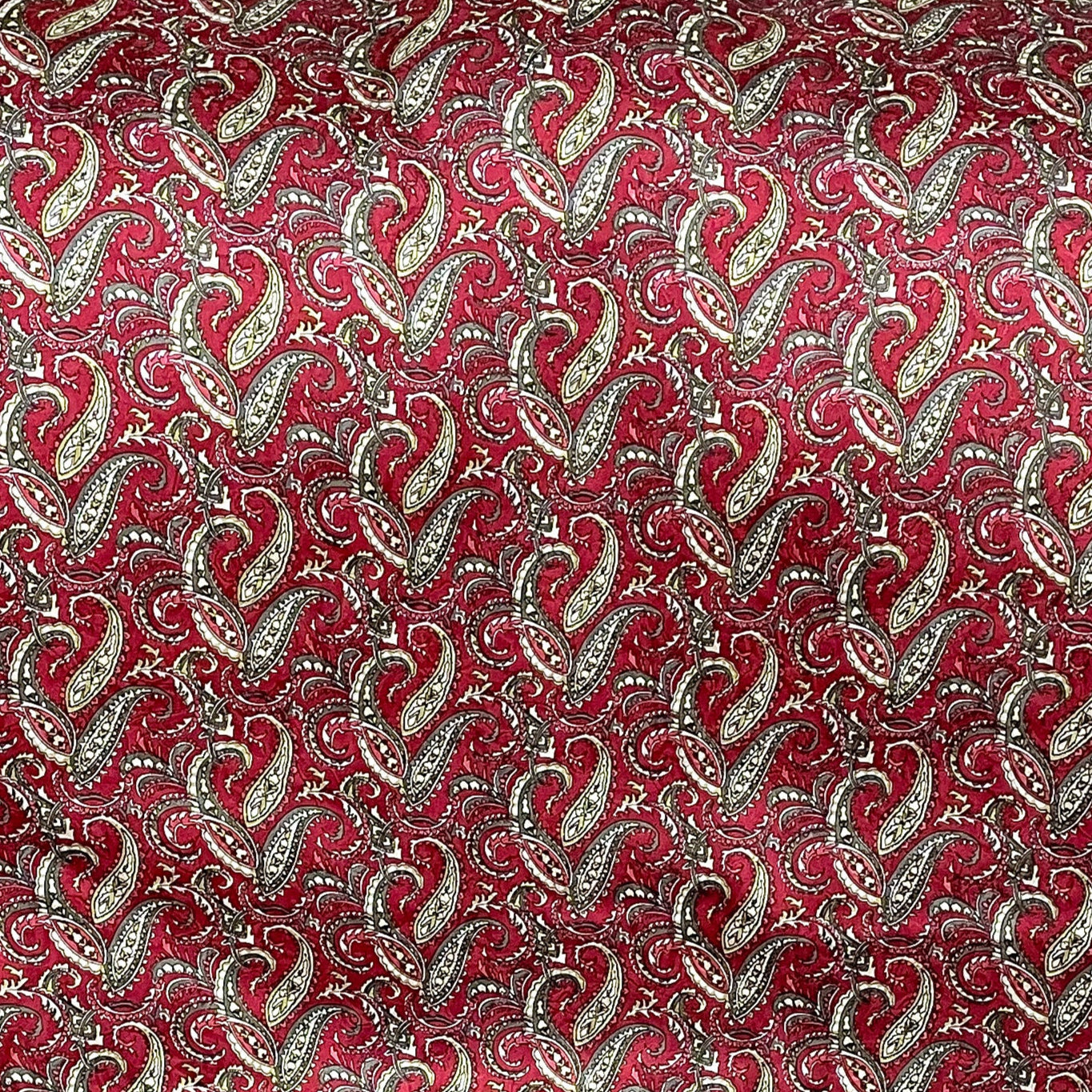 A paisley print wild rag in wine and olive, tied around the neck of a mannequin.