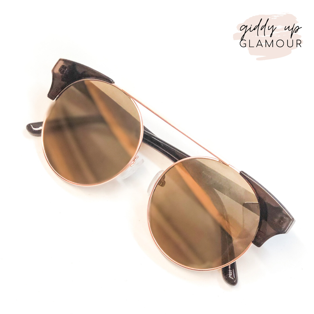 These round cat eye sunglasses features an brown frame with rose gold tone bridge & lense outline. Sunglasses have brown lenses.