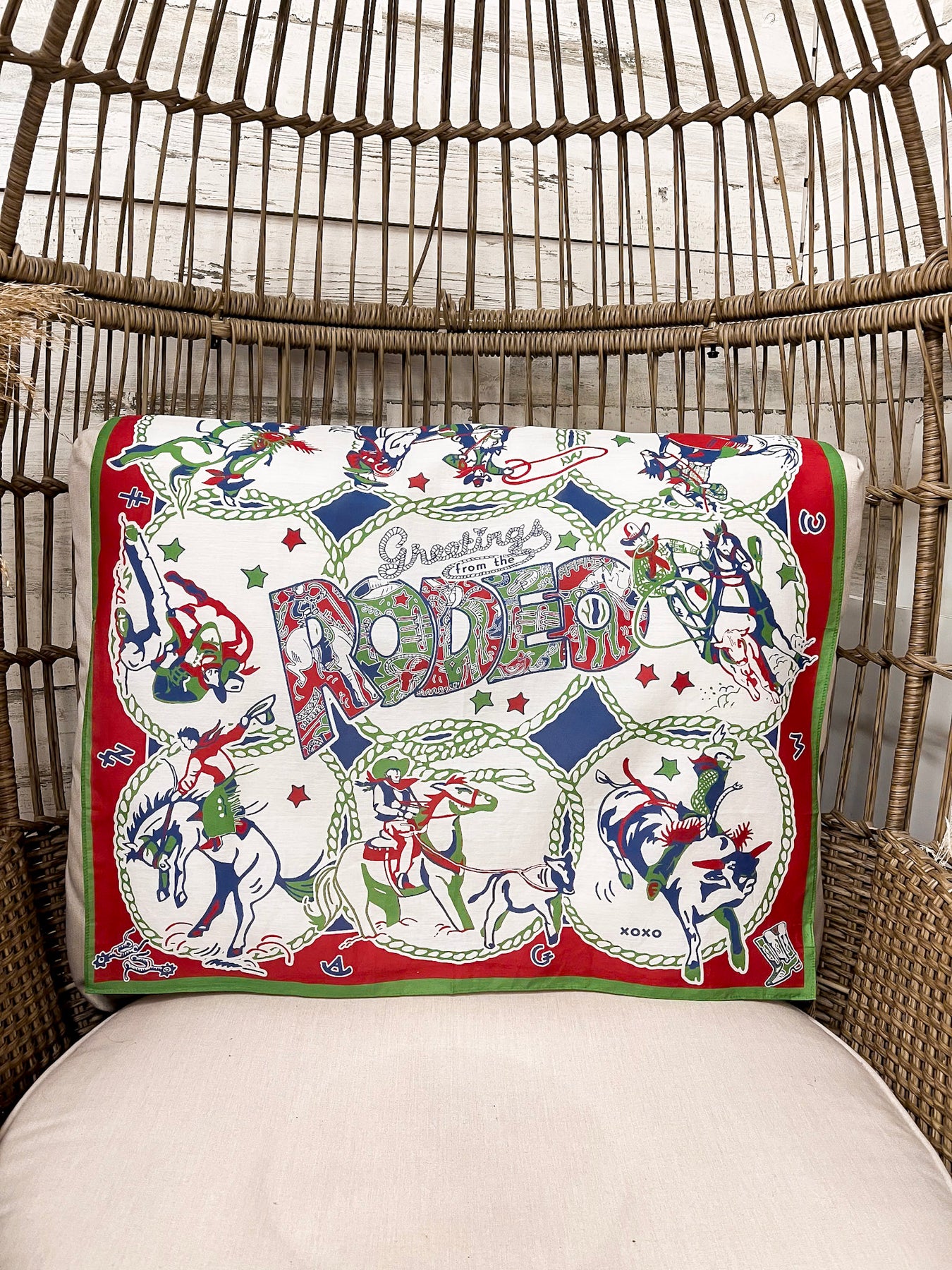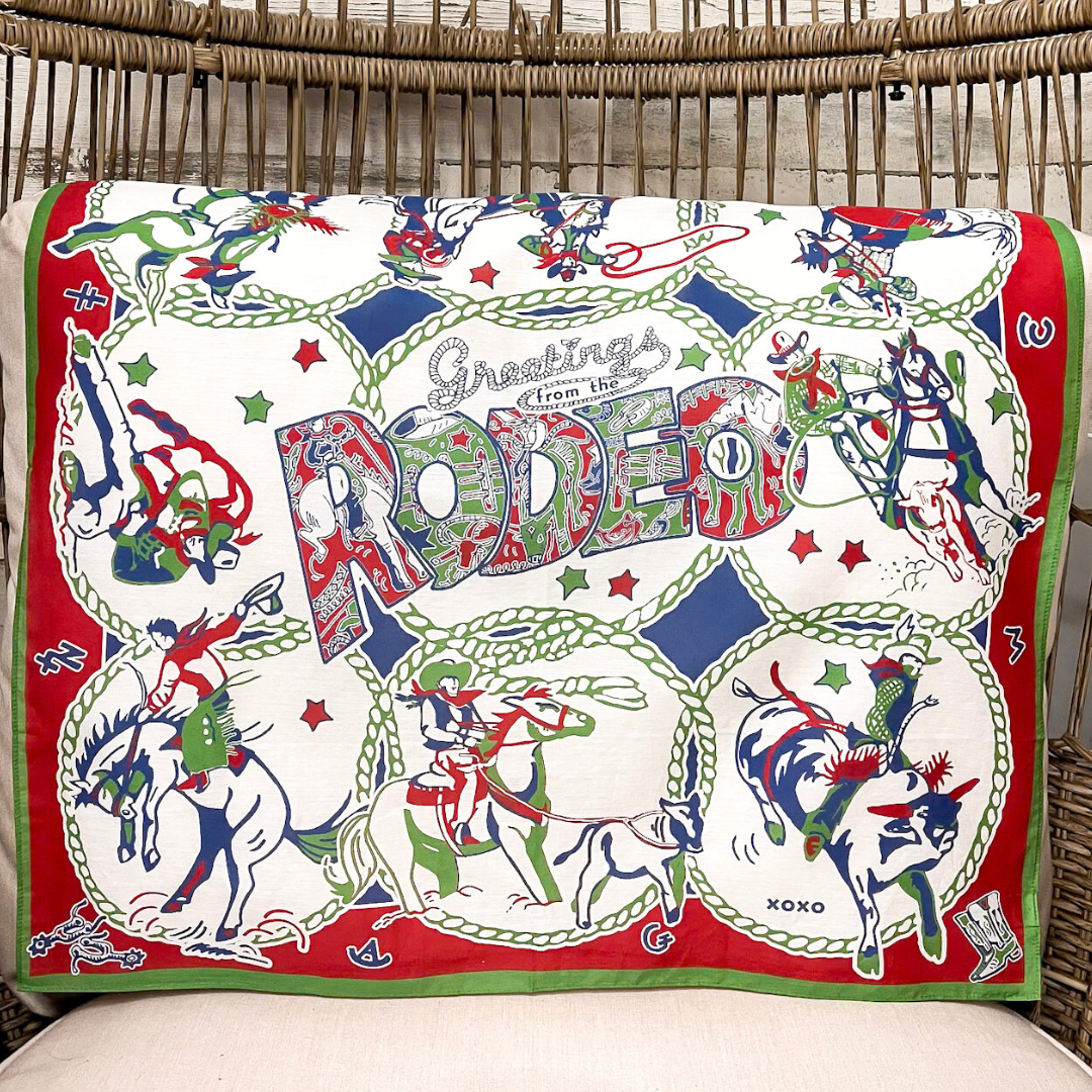 The XOXO Art & Co Greetings from the Rodeo Shorty Wild Rag Scarf in Ivory, Green, Red, and Blue is a fun, nostalgic nod to classic rodeo culture with an artistic twist. Hand-designed and crafted in Texas by a creative mom and daughter duo, this scarf features a lively hand-drawn collage of rodeo scenes, rope details, stars, and bold lettering that feels playful, bold, and full of Western charm.
