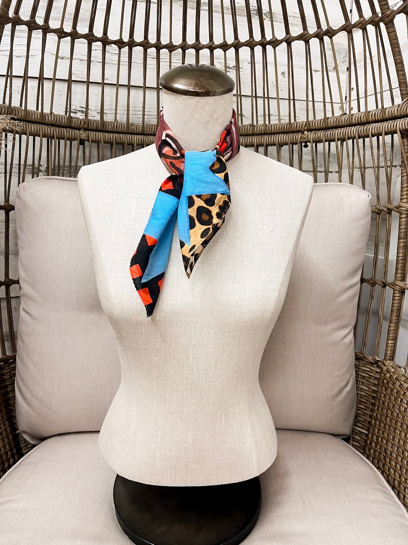 The XOXO Art & Co Star Horse Bandana Scarf in Brown, Blue, and Red is a bold, artistic take on Western Americana. Hand-designed and crafted in Texas by a creative mom and daughter duo, this bandana features a striking horse centerpiece surrounded by patchwork-inspired stars, stripes, and mixed patterns for a look that feels expressive, patriotic, and full of personality. The rich blend of brown, blue, red, and cream tones gives it standout style while remaining easy to wear.