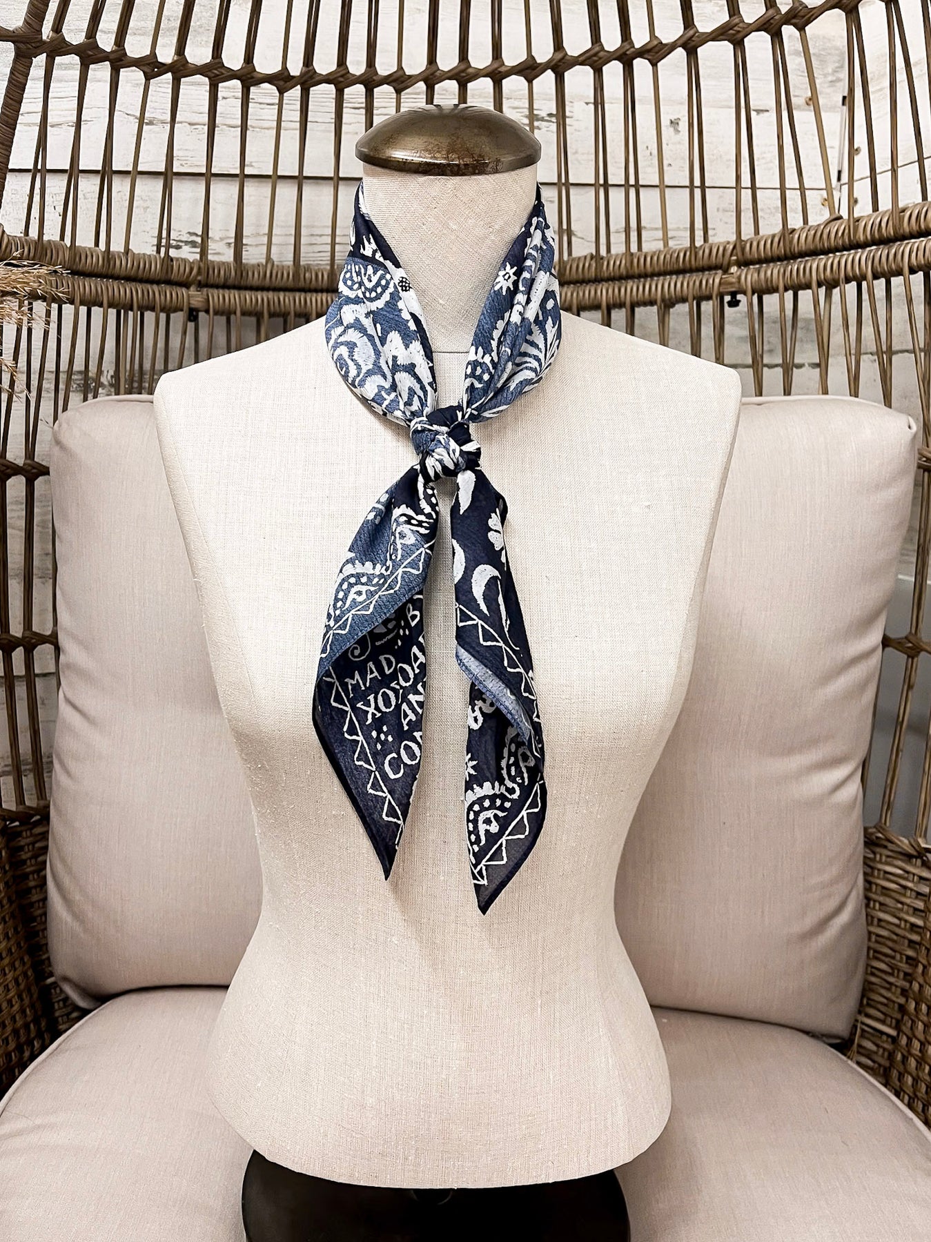 The XOXO Art & Co Woven Corlett Shorty Wild Rag Scarf in Navy Blue is a timeless accessory with rich detail and artisan charm. Hand-designed and crafted in Texas by a talented mom and daughter duo, this scarf features an intricate woven-style pattern inspired by traditional motifs and classic Western artistry. The deep navy background paired with crisp ivory detailing gives it a refined, heirloom-quality look that elevates any outfit.