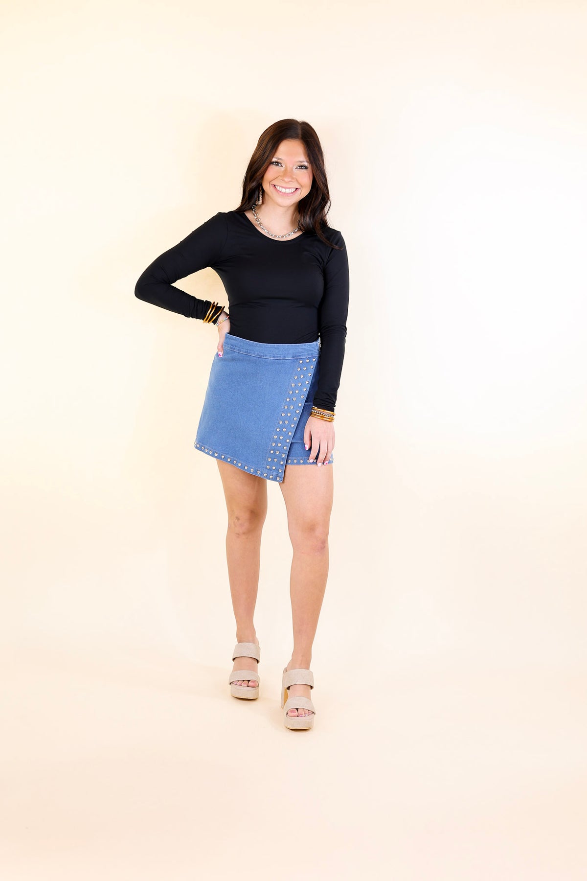 Falling For You Denim Skort with Silver Stud Detailing in Medium Wash