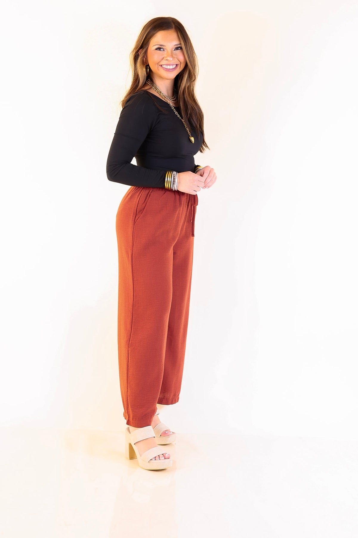 On Repeat Cropped Drawstring Woven Pants in Rust Orange