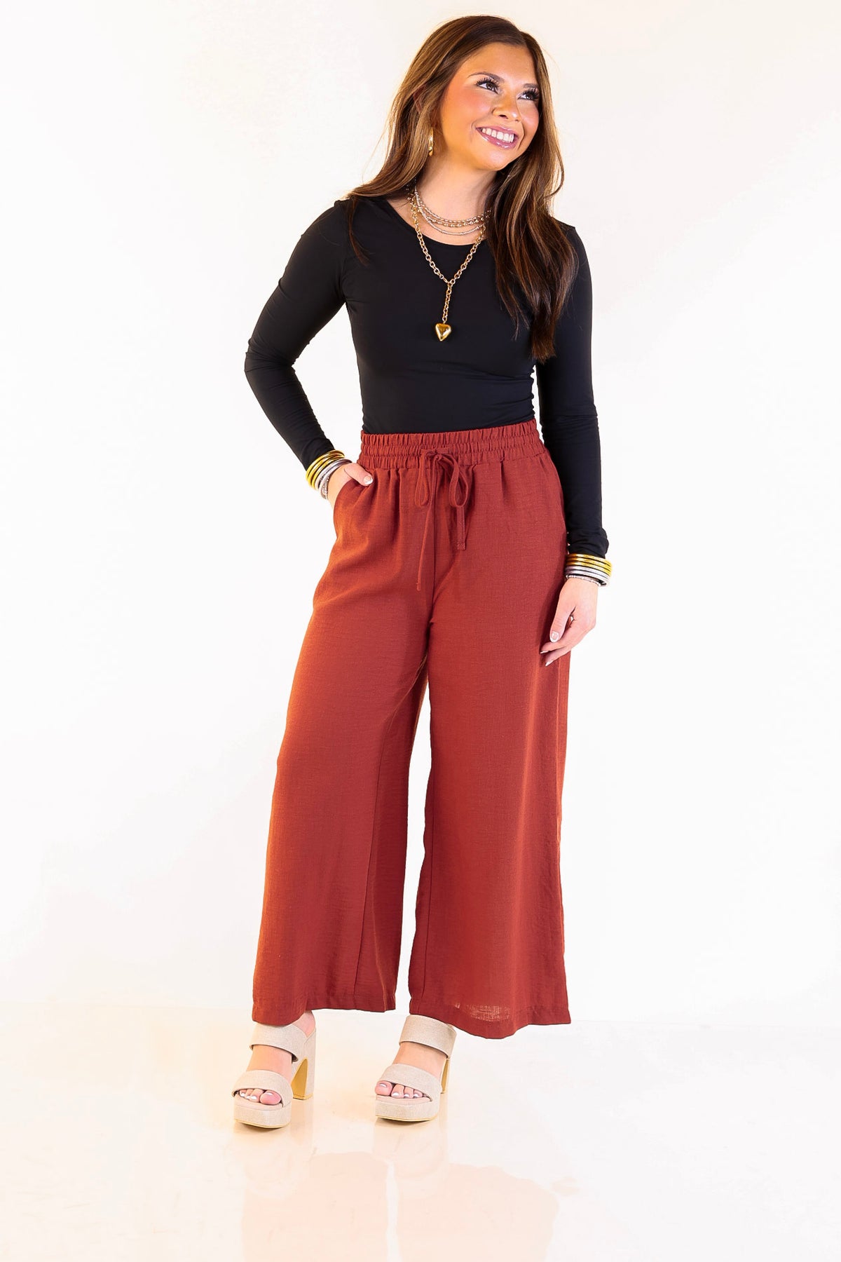 Meet your new closet staple — our On Repeat Cropped Pants. Designed with a relaxed wide-leg fit, these woven crepe pants bring comfort and polish together in one effortless piece. The elastic waistband with adjustable drawstring makes them an easy, flattering fit, while the cropped length keeps them versatile for work, travel, or weekend errands. Side pockets add the perfect touch of function, and the rust color transitions seamlessly into fall. These are the pants you’ll want to wear again and again (and again).