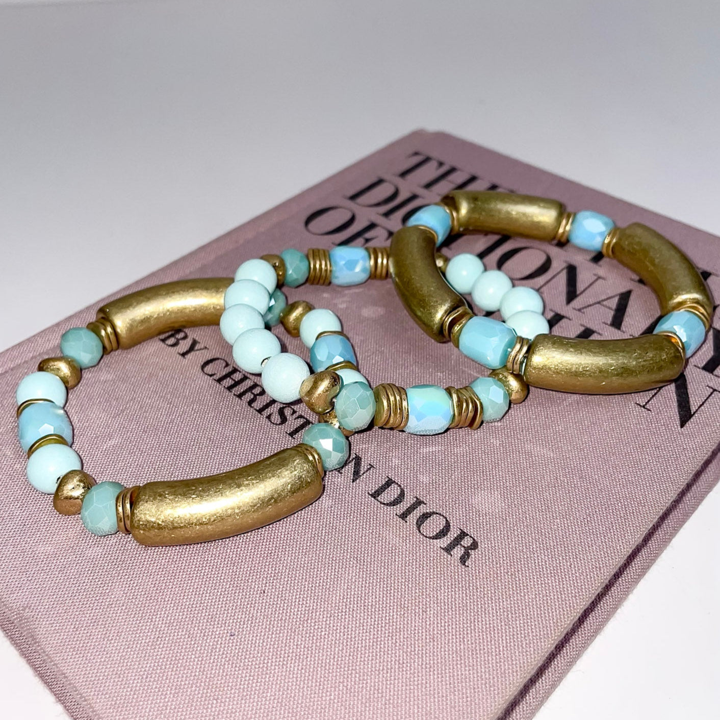 Indulge in the ultimate arm candy with our Mint Blue and Gold 3 Piece Bracelet Set. Featuring a beautiful mint blue and gold color scheme, these bracelets are perfect for adding a touch of elegance to any outfit. Get ready to turn heads and make a statement with this must-have accessory set!