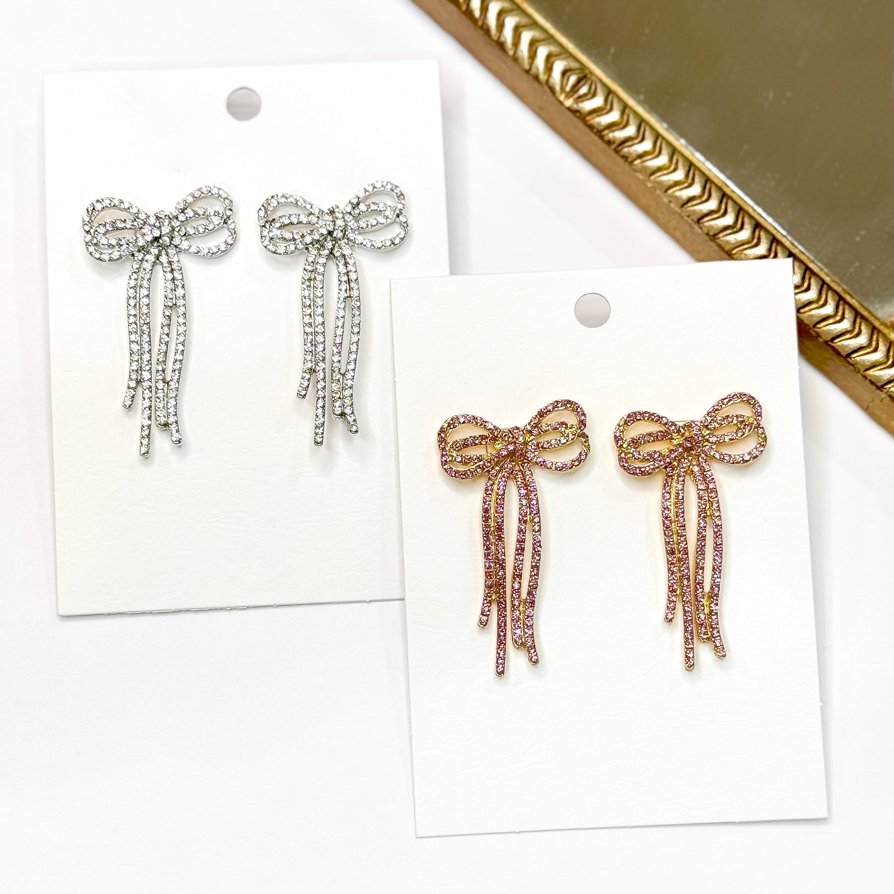 Introducing the Radiant Ribbons Earrings – a stunning addition to any jewelry collection. These exquisite gold-tone earrings feature a double bow design, encrusted with shimmering pink rhinestones that catch the light from every angle. Shaped like elegant long ribbon bows, they add a touch of sophistication and sparkle to any outfit. Perfect for both casual and formal occasions, the Radiant Ribbons Earrings are sure to turn heads and make you shine. Elevate your style with these dazzling earrings and embrace the elegance of radiant ribbons. Available now! Also available in silver!