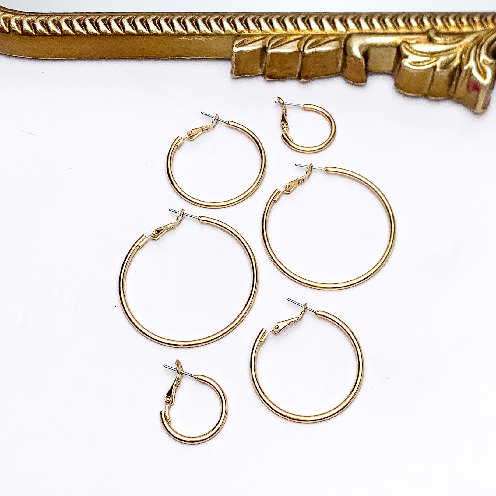 Set of three Gold Tone Hoop Earrings. Ranging in three different sizes for many occasions. A simple accessory to add to any look!
