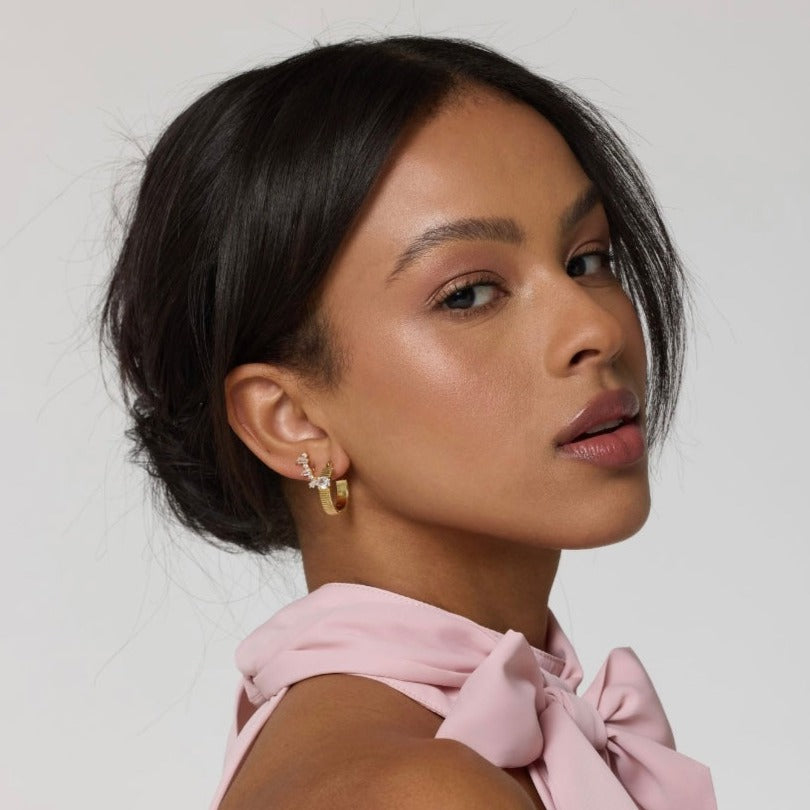 Elevate your style with our Quinn Hoop Earrings, boasting a chic ridged design accented by a dazzling CZ crystal. These earrings offer a perfect blend of modern sophistication and timeless elegance. Make a statement with every wear and add a touch of glamour to any outfit with the Quinn Hoop Earrings.