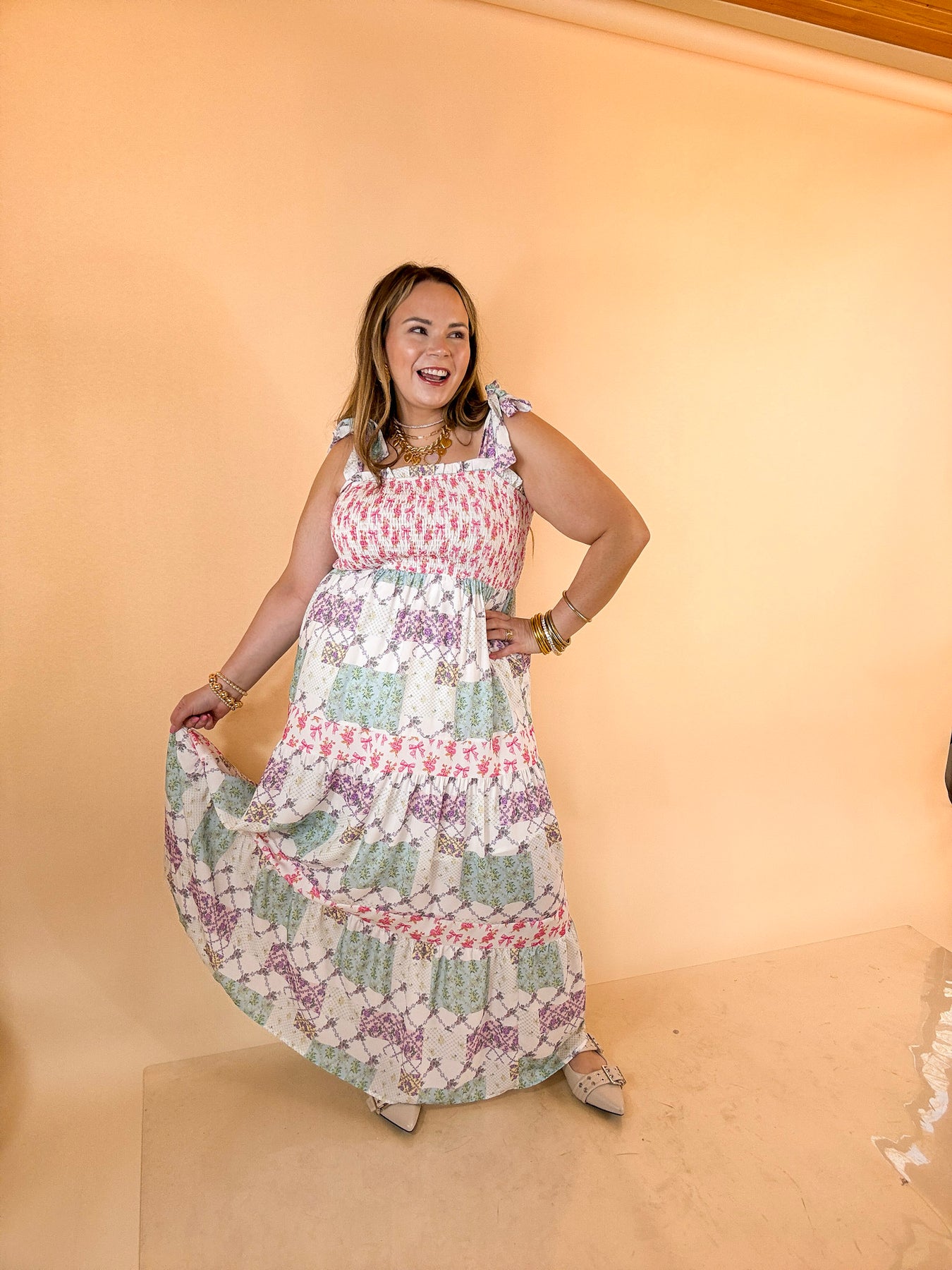 Simply Southern | Spring Symphony Patchwork Print Smocked Maxi Dress with Shoulder Ties and Tiered Skirt in Multi Floral