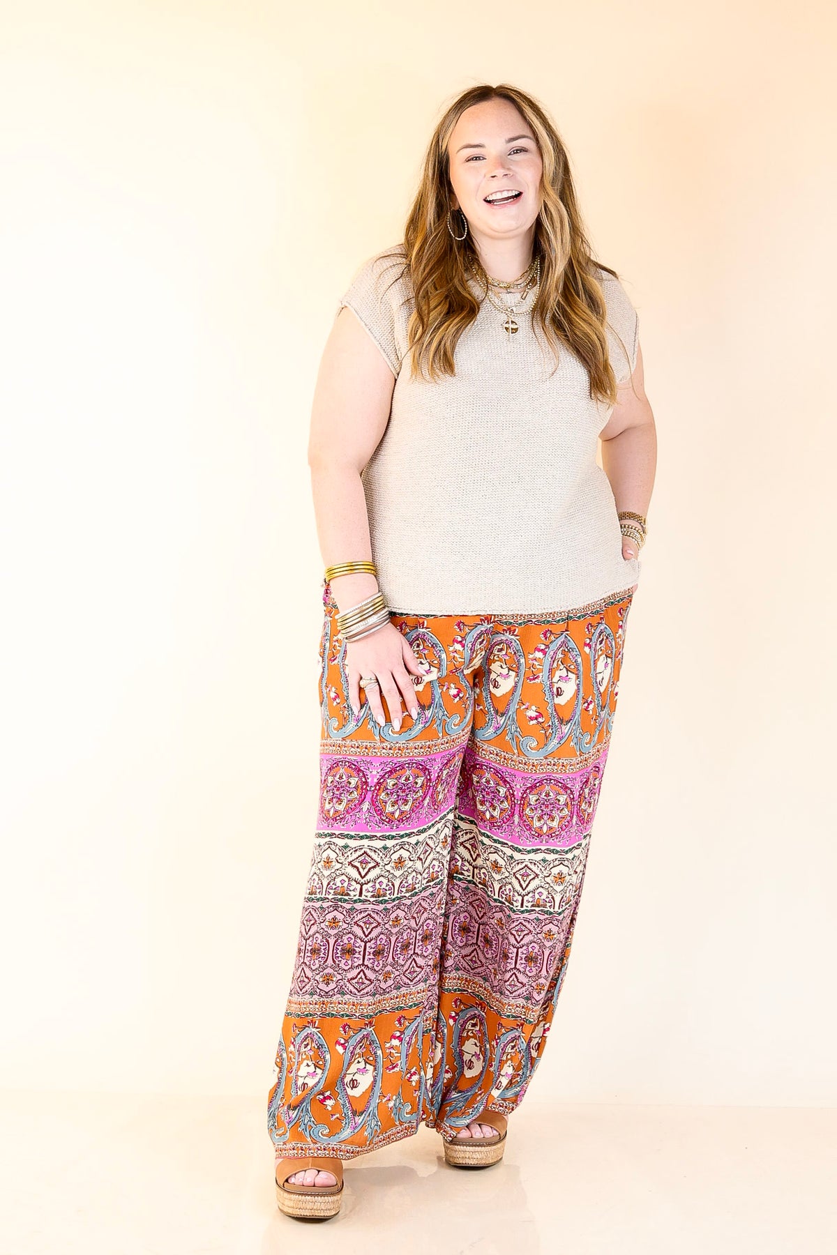 Embrace the changing seasons with these Slight Change Elastic Waist Floral Print Wide Leg Palazzo Pants in a warm rust orange mix. Designed for comfort and style, they feature a relaxed wide leg silhouette and a stretchy elastic waistband that moves with you all day long. Practical pockets add convenience, perfect for keeping essentials close. Pair them with a flowy blouse or a quirky graphic tee to create playful, effortless outfits that celebrate fall’s cozy vibes. These pants are your new go-to for easy, breezy style that feels as good as it looks!