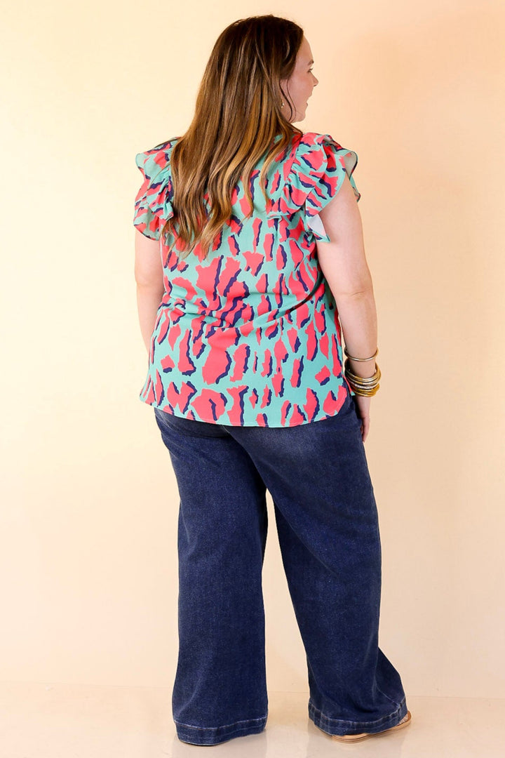 Wild Whirl Multi Colored Leopard Print Blouse with Ruffle Cap Sleeves in Mint