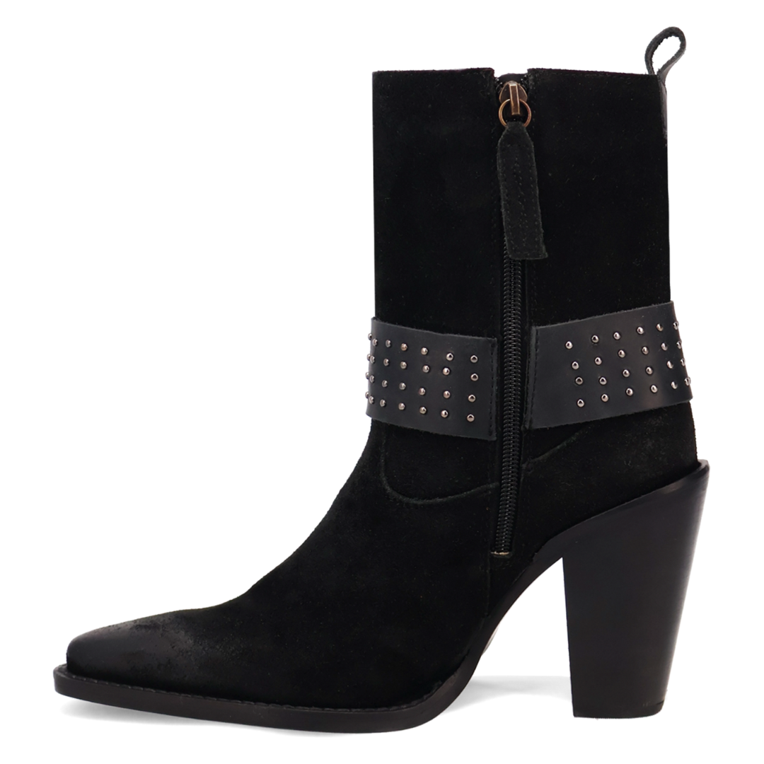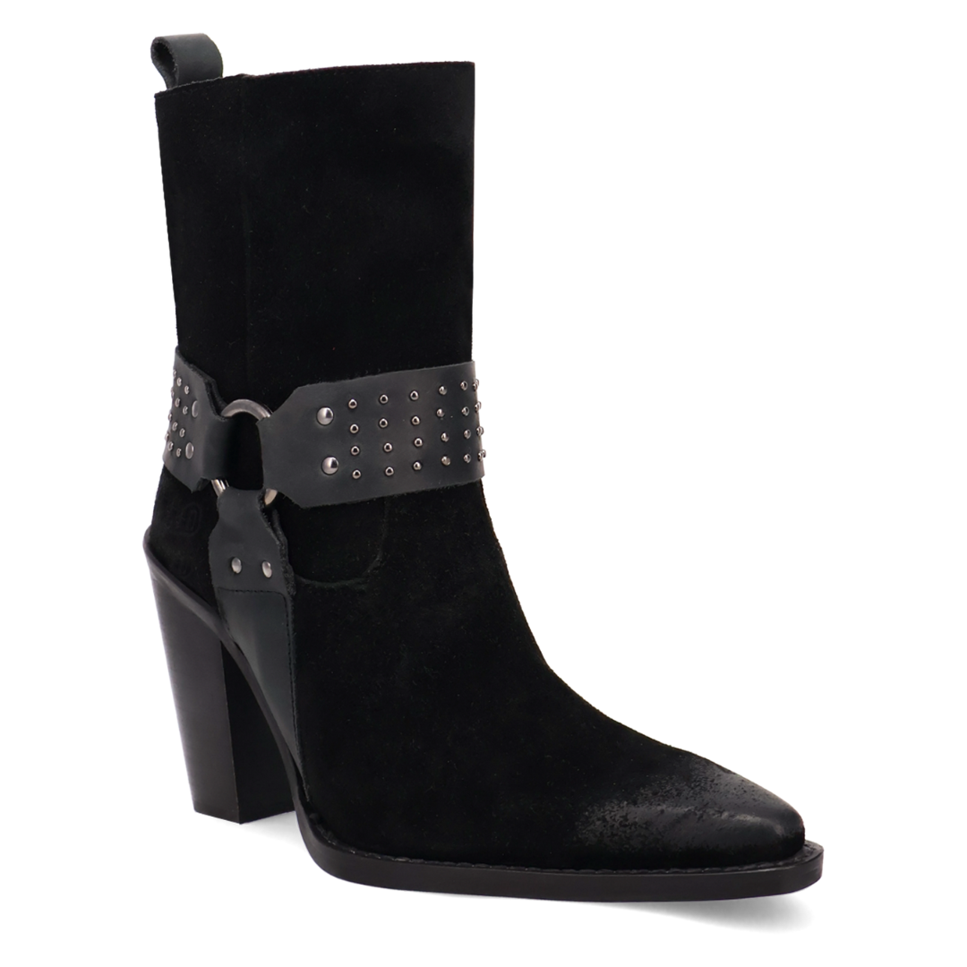 These booties are sleek, black ankle boots with a Western-inspired design. They feature a pointed toe and a sturdy, angled block heel for a modern yet timeless look. The standout detail is the studded leather harness strap, which wraps around the ankle and is secured with metallic ring hardware for an edgy touch. Crafted from suede, these boots exude both sophistication and rugged charm. Perfect for adding a bold statement to any outfit.