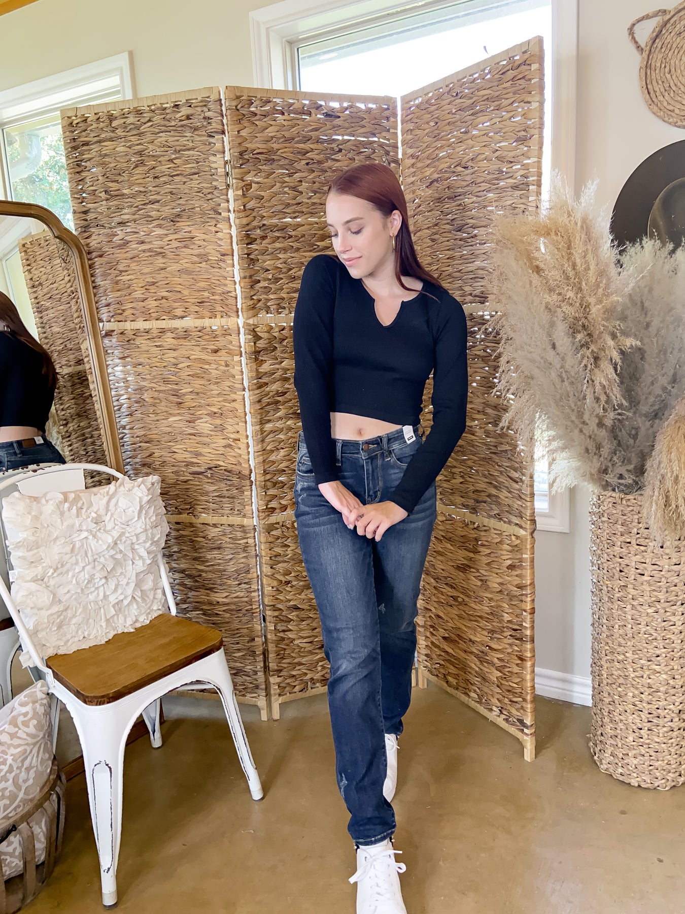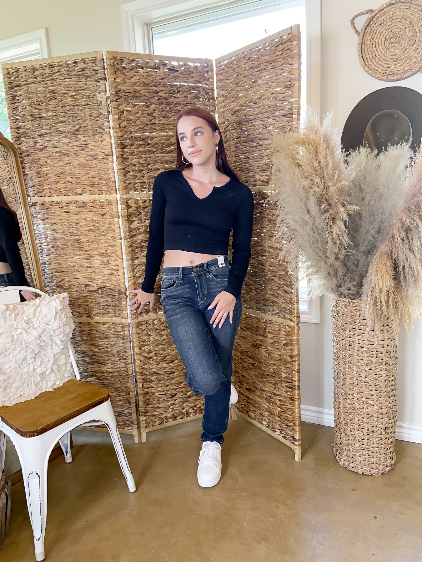 Dream Babe Notched Neckline Crop Long Sleeve Top in Black