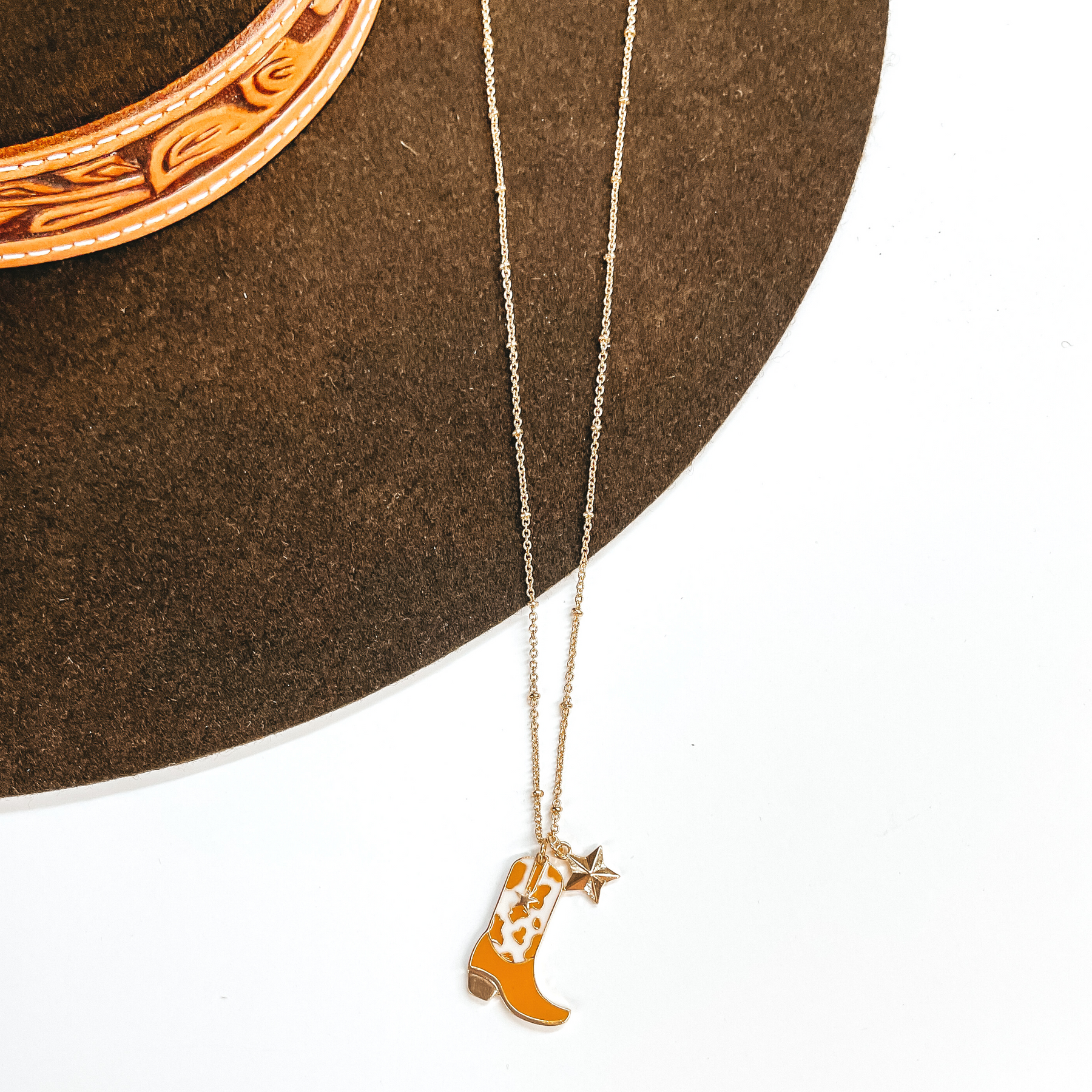 Kick Your Boots Up Gold Necklace with Cow Print Boot Pendant in Ivory and Tan