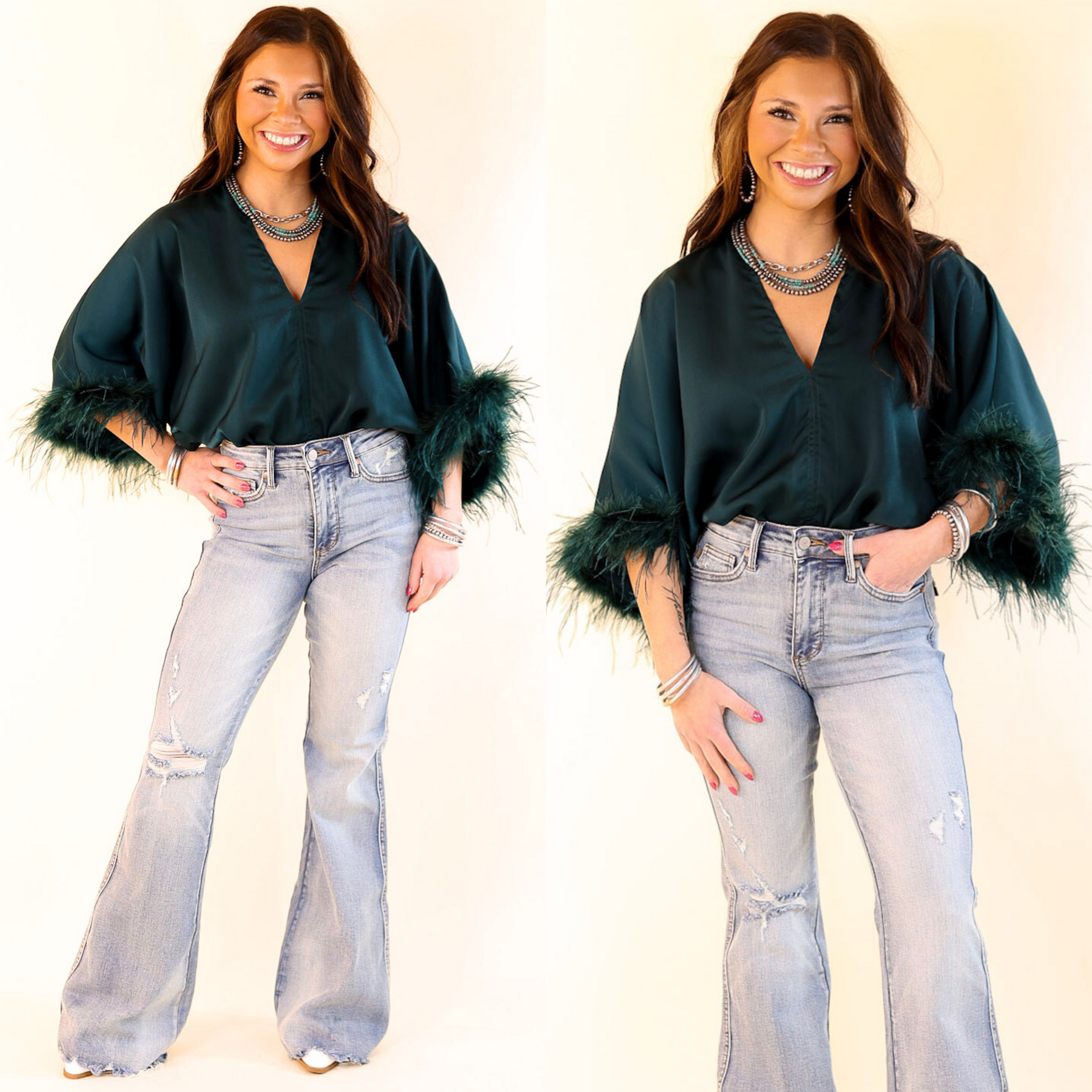 You'll need party plans ASAP to show off this adorable top! It includes a deep v neckline, flowy half sleeves with faux feather trim, and a two snap closure at the bottom. Pair it with turquoise jewelry and a bright hat to be the star of the show!