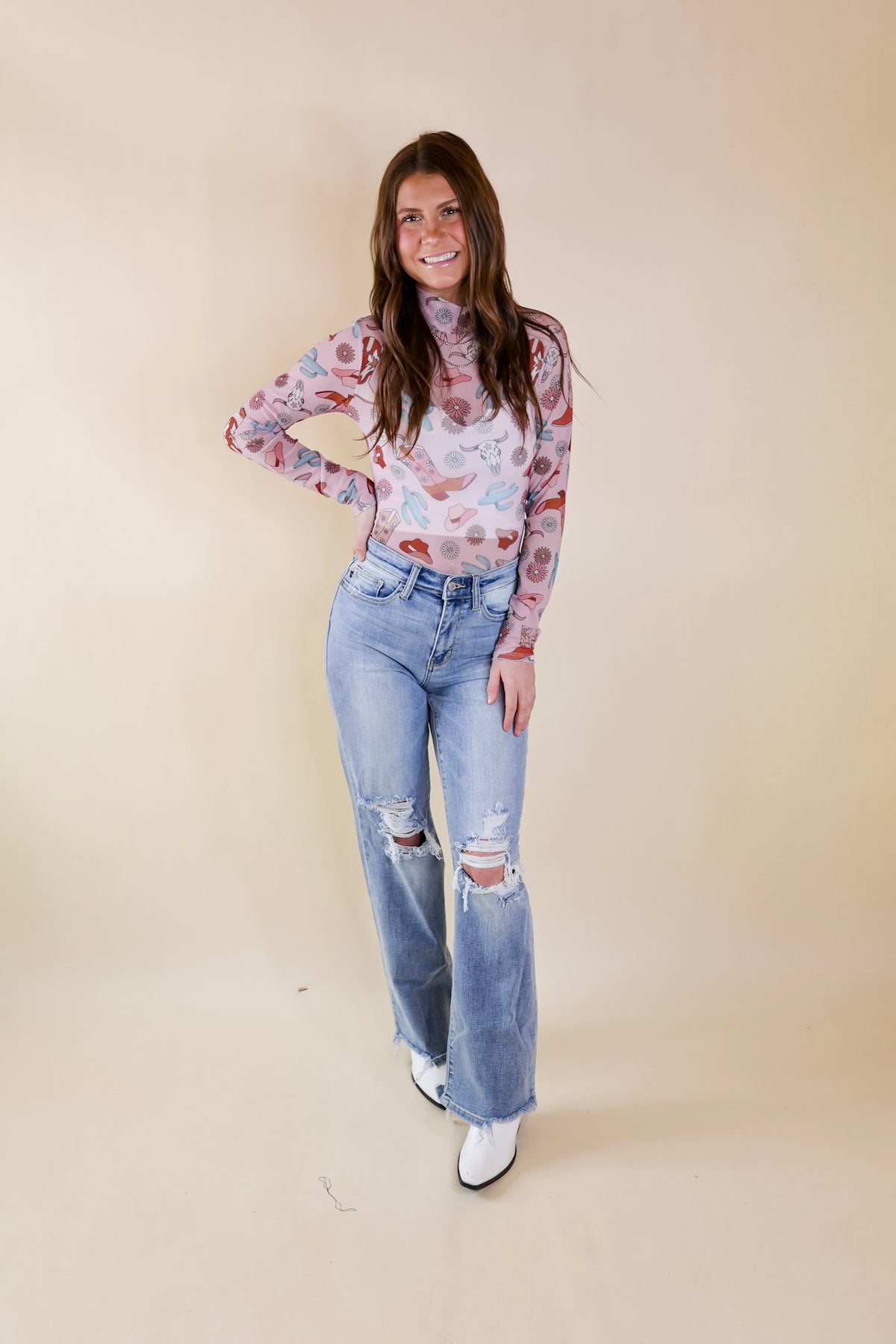 Try Your Luck Western Print Mesh Long Sleeve Bodysuit in Blush Pink