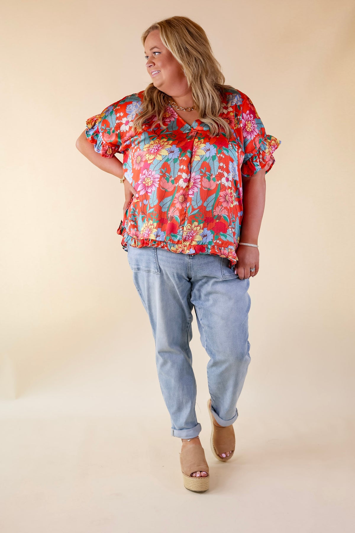 Embrace a blissful mindset with our charming 'Blissful Mindset' top! This delightful piece features a flattering v neckline, playful short sleeves adorned with ruffles, all complemented by a vibrant floral print on a cheerful orange body. Elevate your spring wardrobe with this joyful addition!