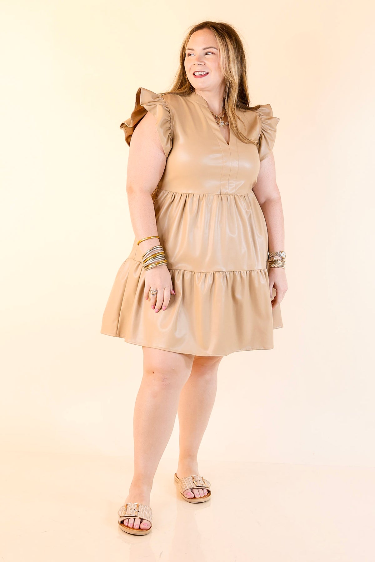 This beautiful faux leather dress is the perfect statement for all seasons! You can add accessories to fit any type of occasion! It includes a notched v neck, ruffle cap sleeves, a ruffle tiered body, and a classy short length.