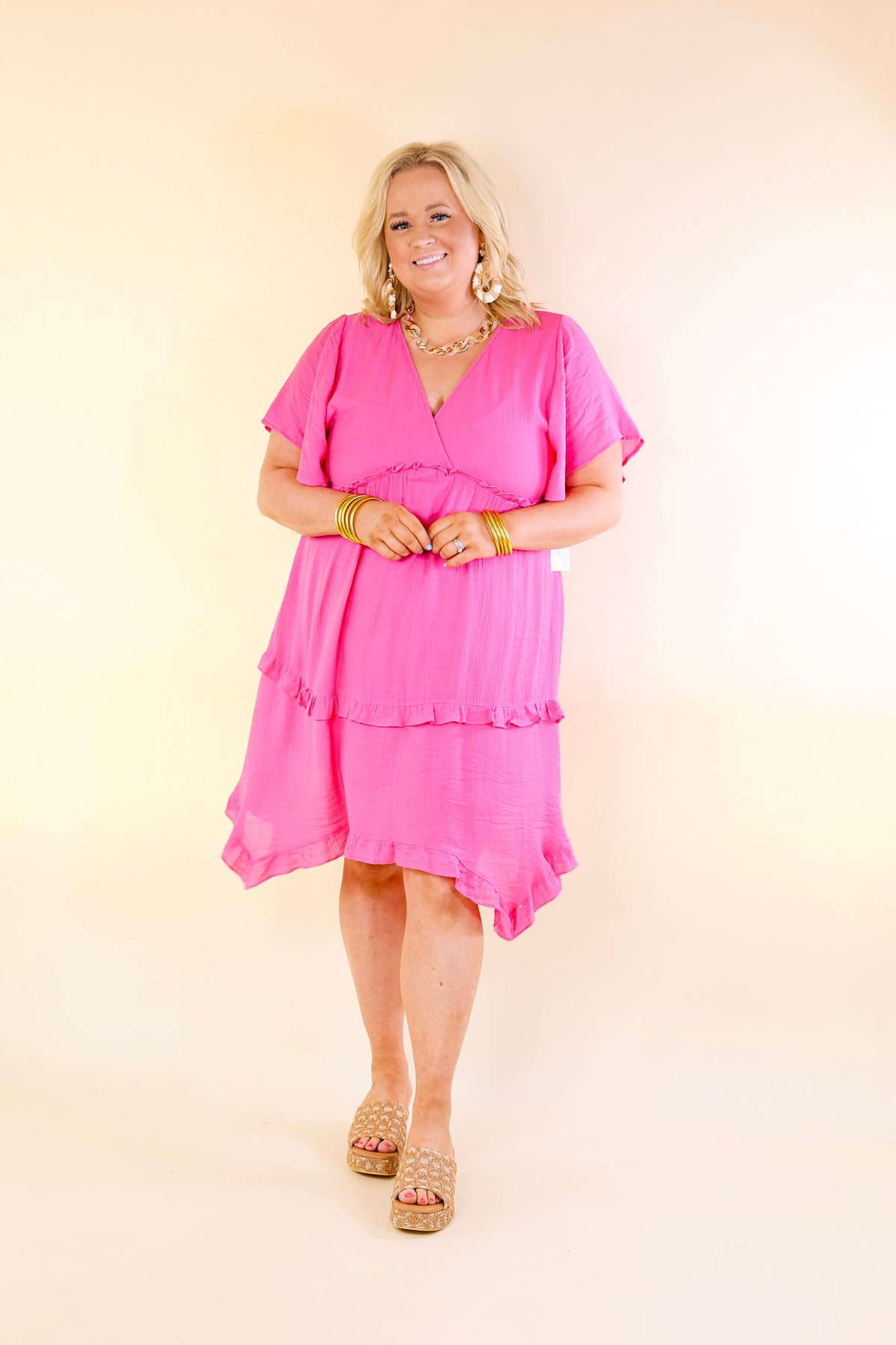 Get ready for a movie moment in this adorable new dress! It offers so much comfortable style. It includes short sleeves with ruffle detailing, a ruffle tiered body, and v neckline. Pair this with booties for a cute look!