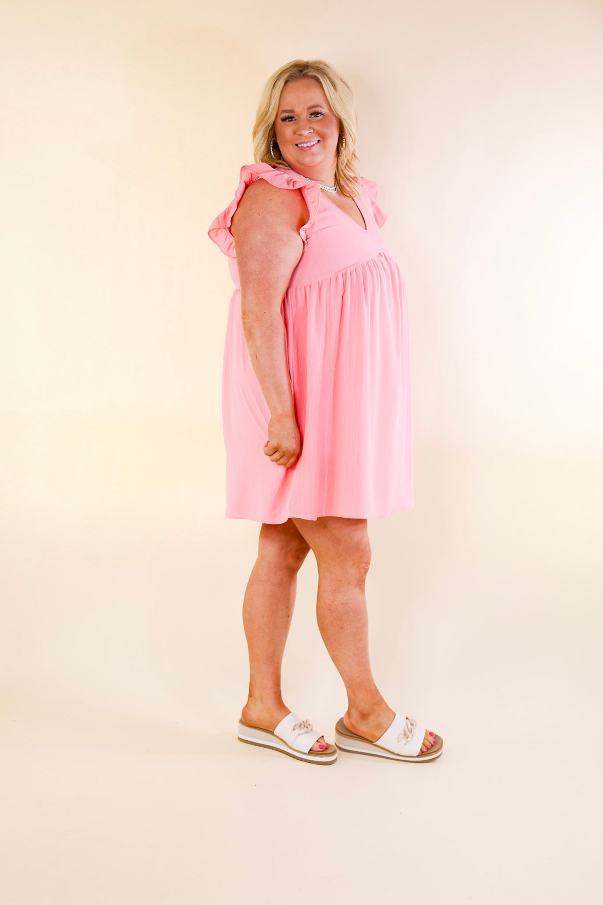 Capture Your Attention V Neck Dress with Ruffle Cap Sleeves in Bubblegum Pink - Giddy Up Glamour Boutique