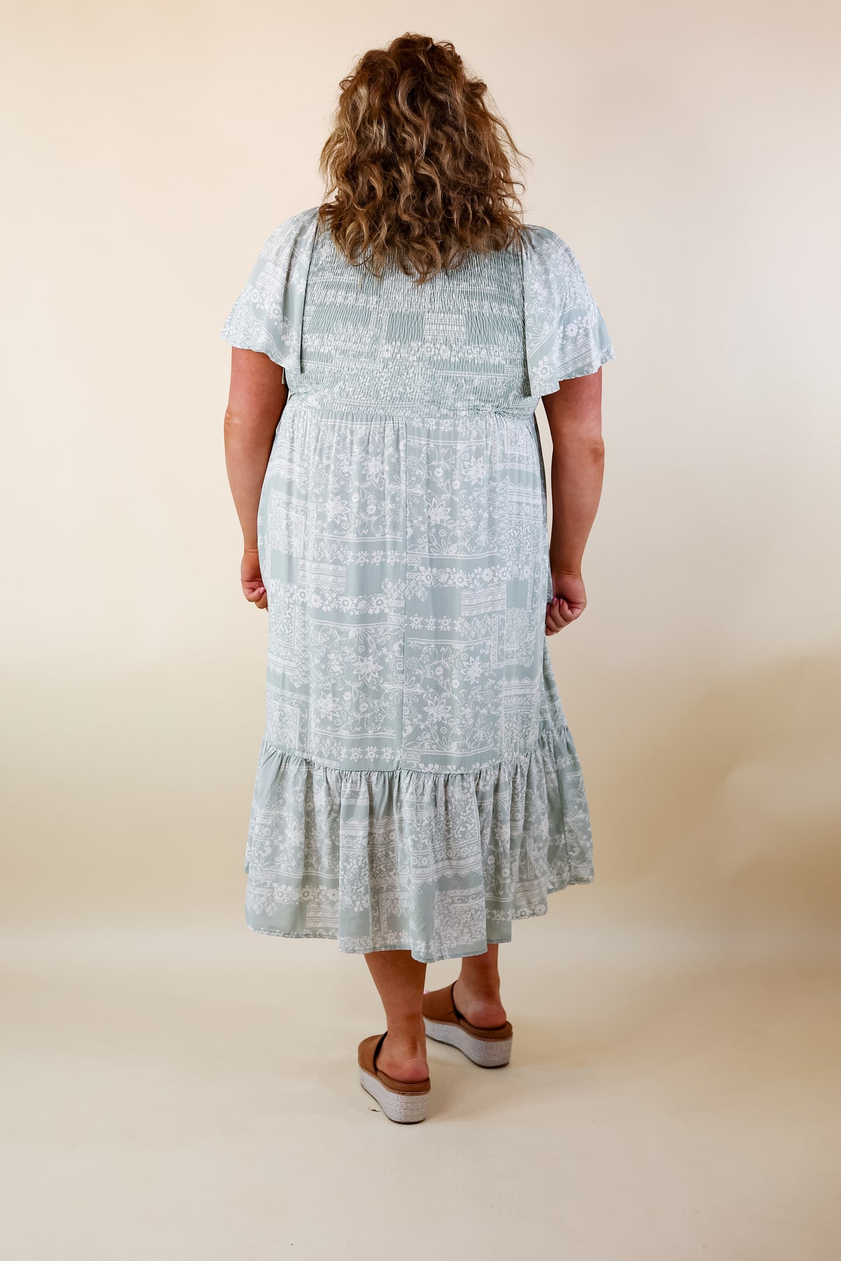 Adore The Shore Block Print Midi Dress with Smocked Bodice in Sage Green