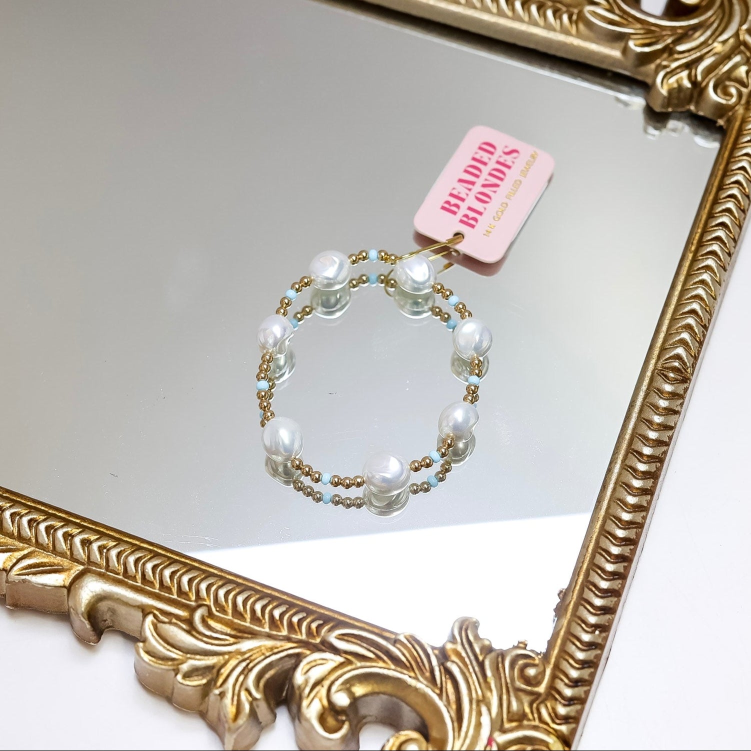 The Sadie bracelet combines oversized synthetic pearls with powder blue Czech glass beads and 3mm gold-filled beads for a chic look. Handcrafted in College Station, Texas. It’s waterproof, durable enough for workouts, and resistant to tarnishing. To maintain its shine, avoid contact with harsh chemicals that may cause minor darkening. Add this versatile and elegant piece to your collection for effortless style and lasting wear.