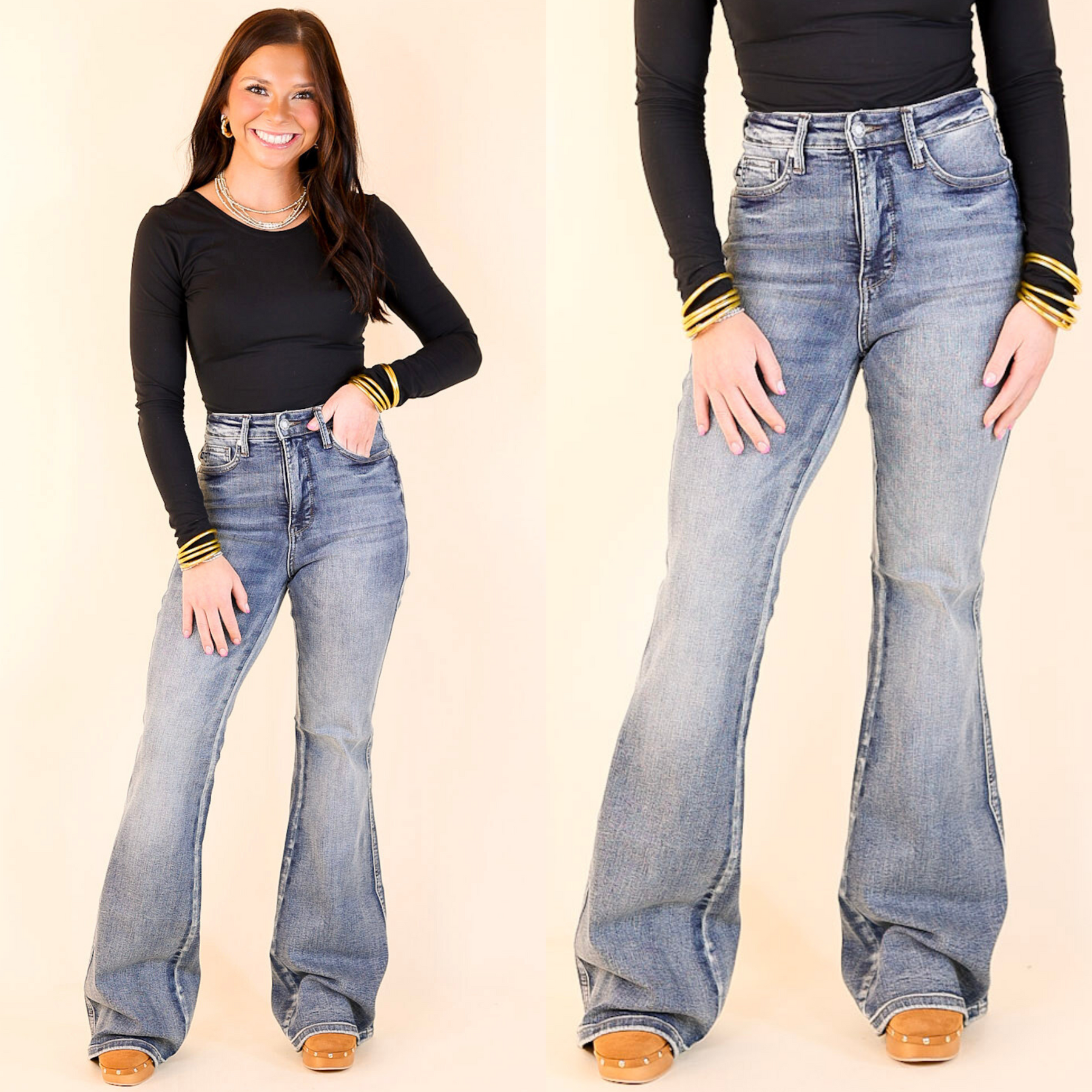 Elevate your style with Judy Blue's 'Modern Muse' Flare Jeans. These high-waisted jeans feature a figure-flattering flare design and are crafted with advanced tummy control technology, ensuring a sleek, sculpted fit. The unique contrast wash adds a bold, modern twist to a classic silhouette, making these jeans perfect for everything from casual days to night-out looks. Designed with Judy Blue’s renowned comfort and quality, the 'Modern Muse' jeans provide both style and confidence in every wear.