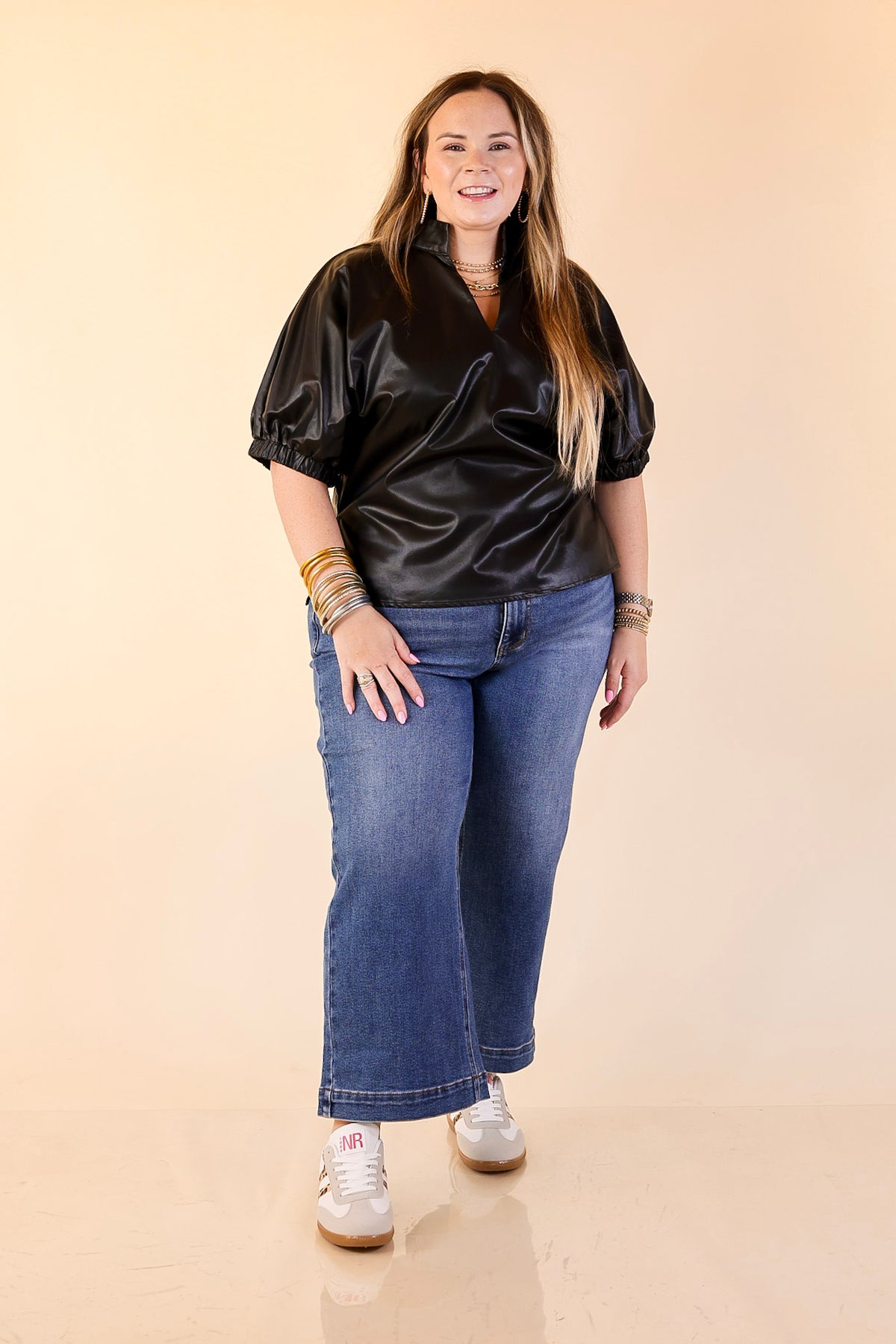 Effortlessly Cool Faux Leather Top with Short Balloon Sleeves in Black