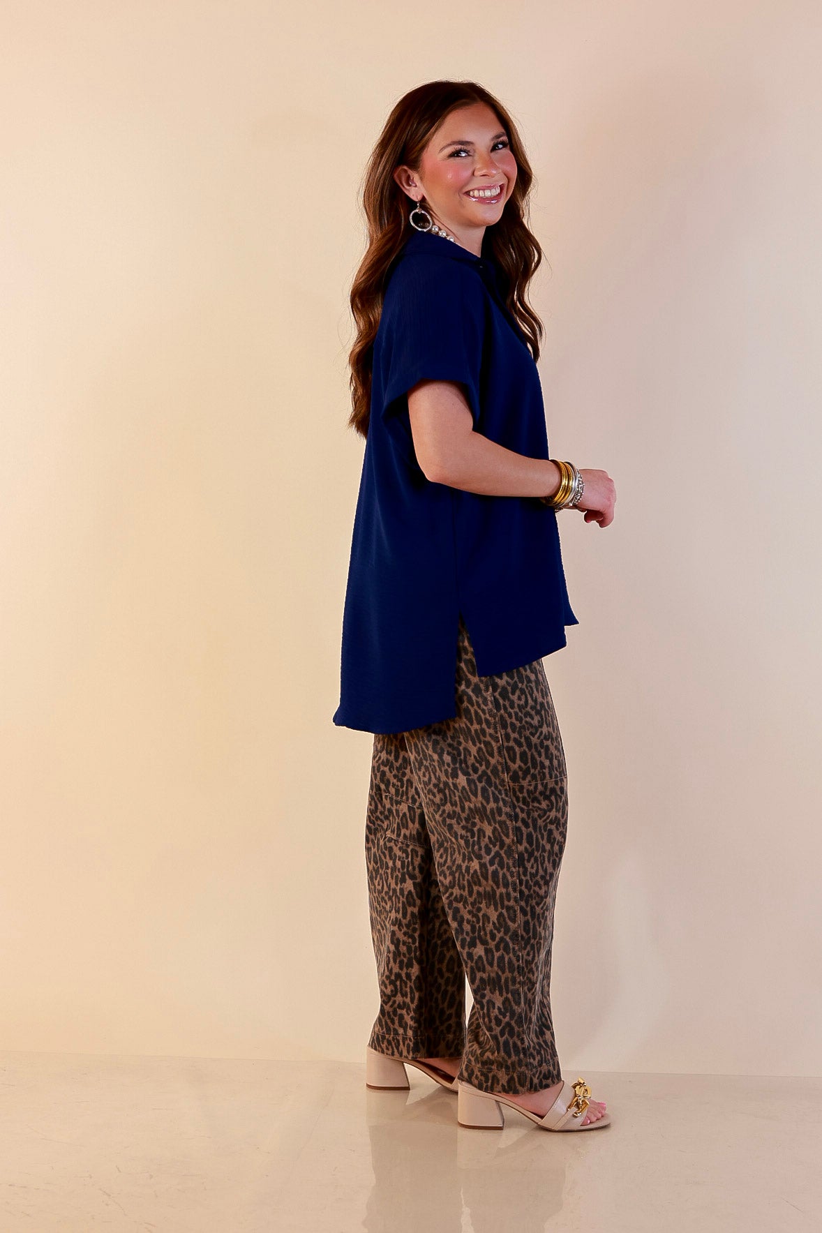 The relaxed silhouette drapes beautifully without clinging, while the collared neckline and button front keep the look polished and timeless. Rolled cuff short sleeves give it that effortless, laid-back touch, and the front chest pocket adds just enough detail to keep it versatile and everyday-ready. The navy blue color makes this one extra easy to style with white denim, classic blue jeans, printed bottoms, or layered open over a tank.