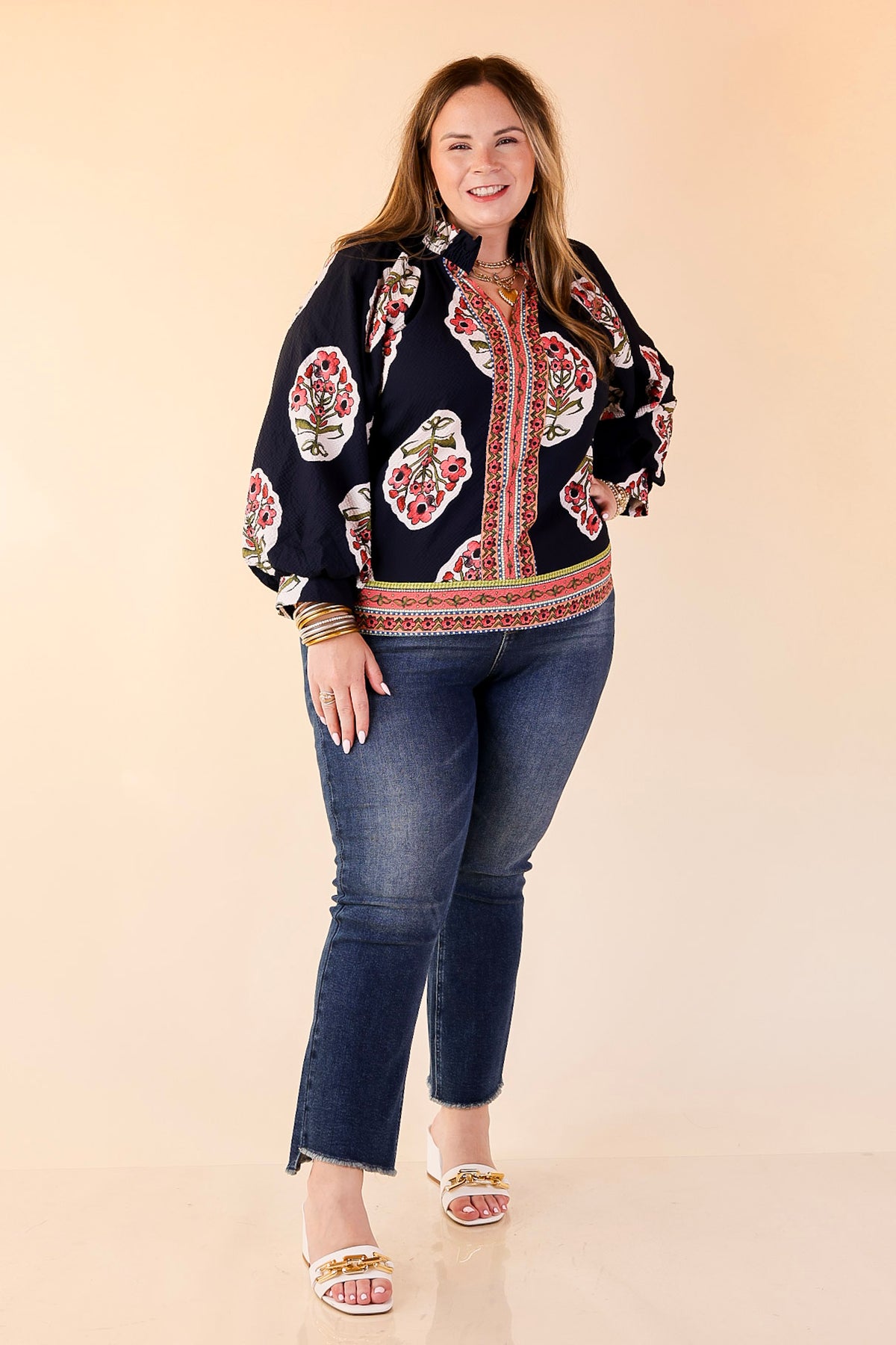 Bring a touch of effortless charm to your wardrobe with our Farmers Market Flair Floral Print V Neck Top. Set against a rich navy backdrop, bold red-and-white floral medallions make this piece a standout. The artisan-inspired border print trims the neckline and hem for a handcrafted feel, while long balloon sleeves add a polished, feminine finish.