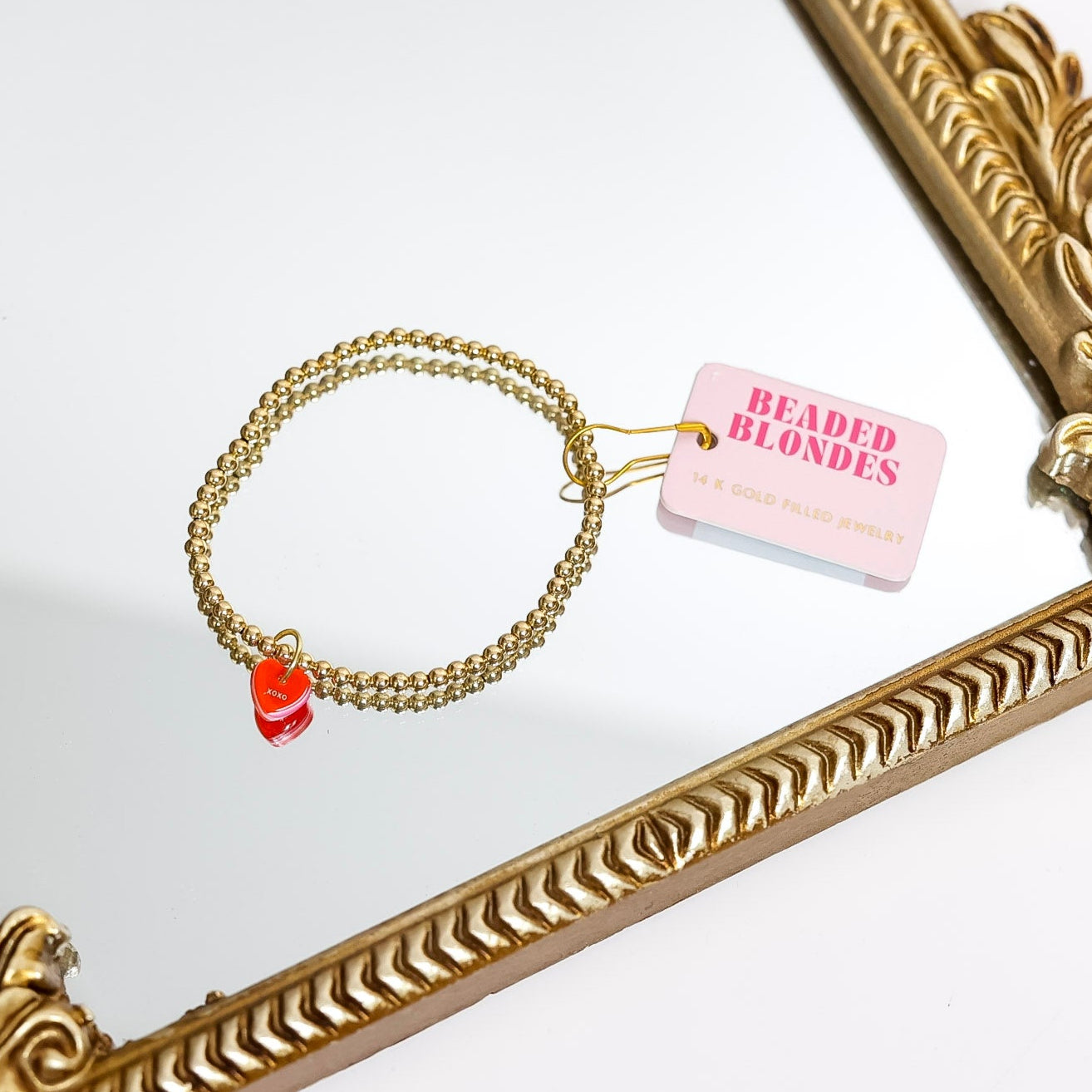 Enhance your style with our Beaded Blondes bracelet, adding a charming touch of sweetness. This durable and water-resistant 3mm gold filled bracelet boasts a hidden XOXO message on its conversation heart charm. Perfect for any occasion, this 14K gold filled and elastic string bracelet features a 3mm gold beaded stretch design and an acrylic bead that will not fade, making it workout and tarnish proof.