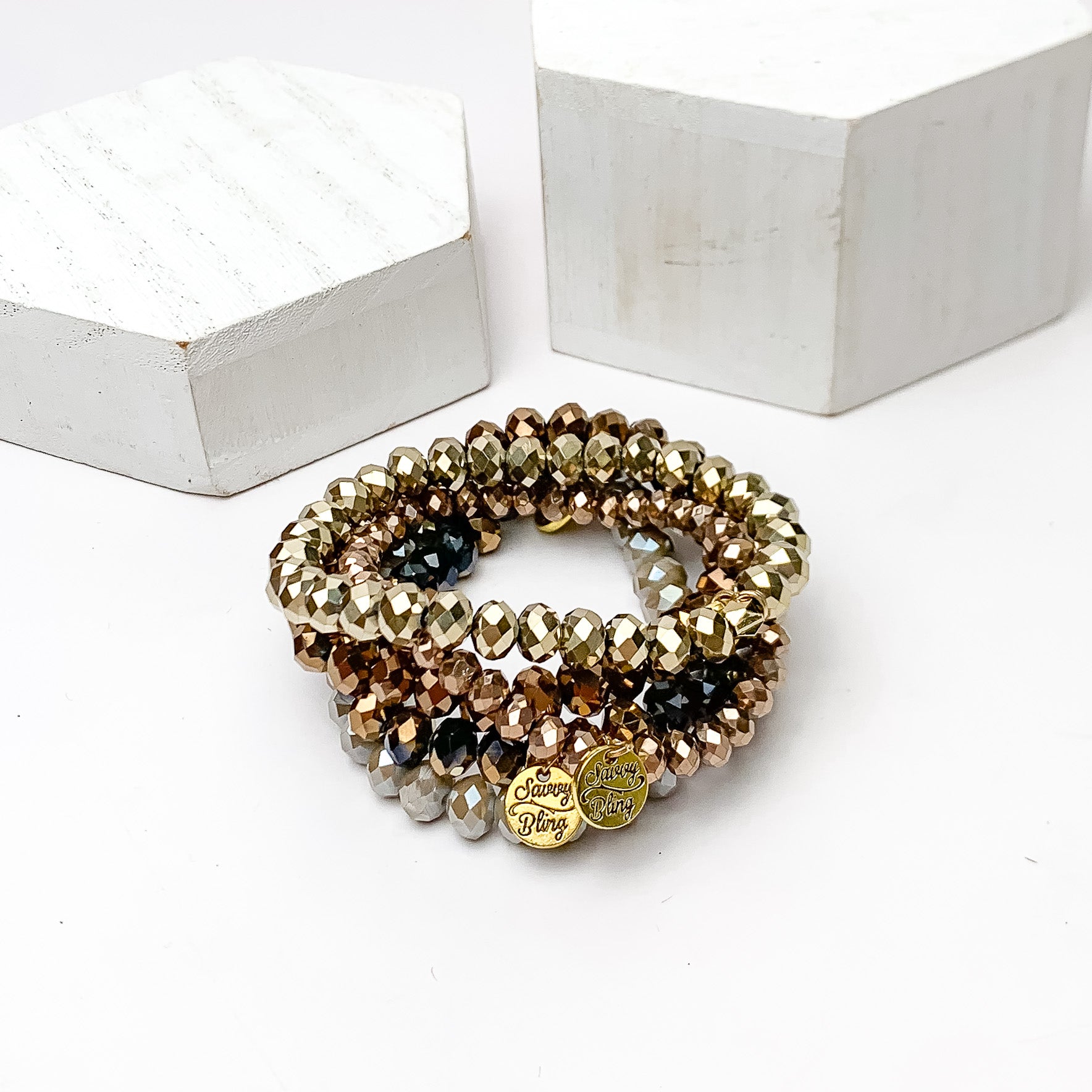 Create the perfect look with this set of five crystal beaded bracelets in gorgeous gold tone colors. Easy to match with an endless amount of outfits. Add these bracelets to your look to sparkle all night long!