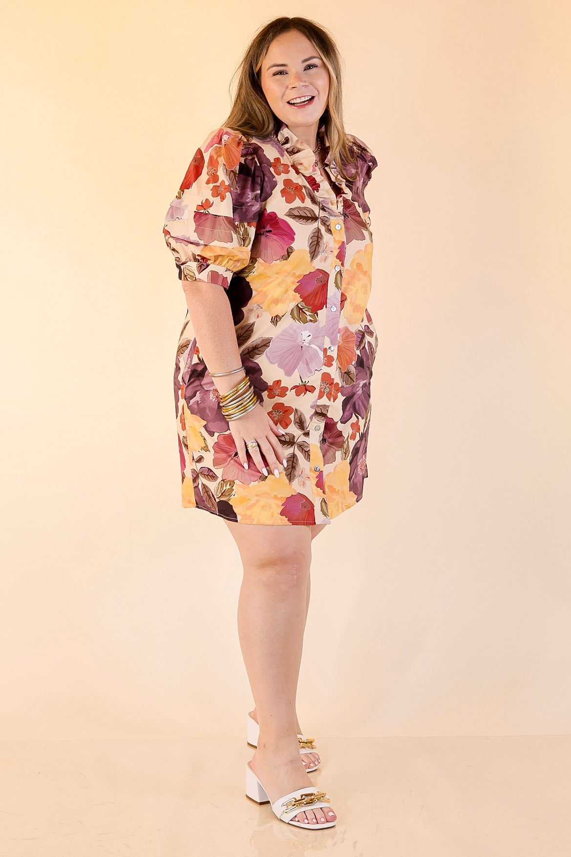 Blooming Statement Button Up Dress with Ruffle Trim and Puff Sleeves in Cream Mix