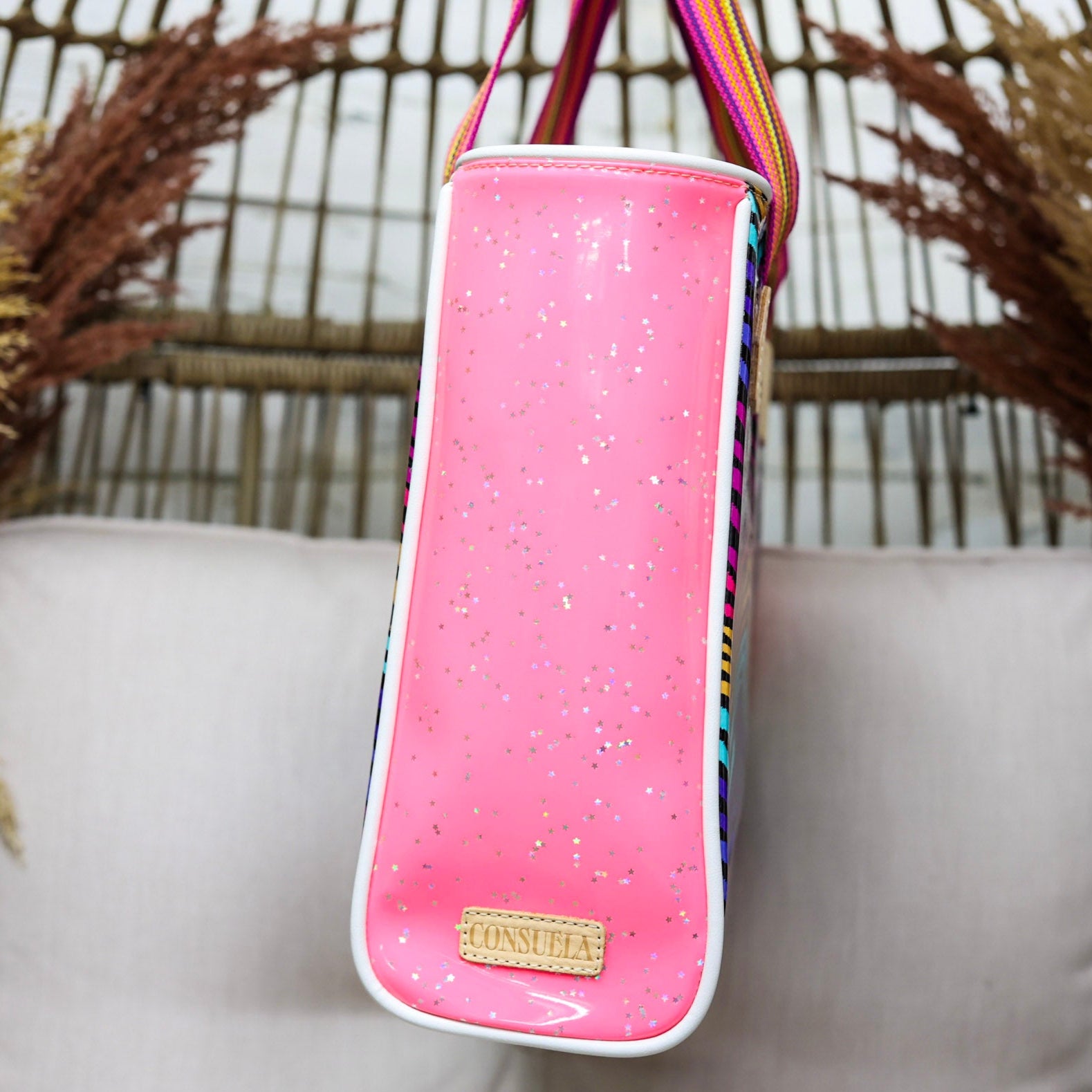 The Vanessa Classic Tote she's electric! Vanessa is a totally rad combo of bright hues, this charming design is both captivating and bold. Ideal for a busy lifestyle, this versatile tote is complete with woven handles for comfortable carrying, natural leather trimming, and a structured shape. Its spacious interior and various pockets make it a perfect choice for organizing your laptop, keys, and phone.