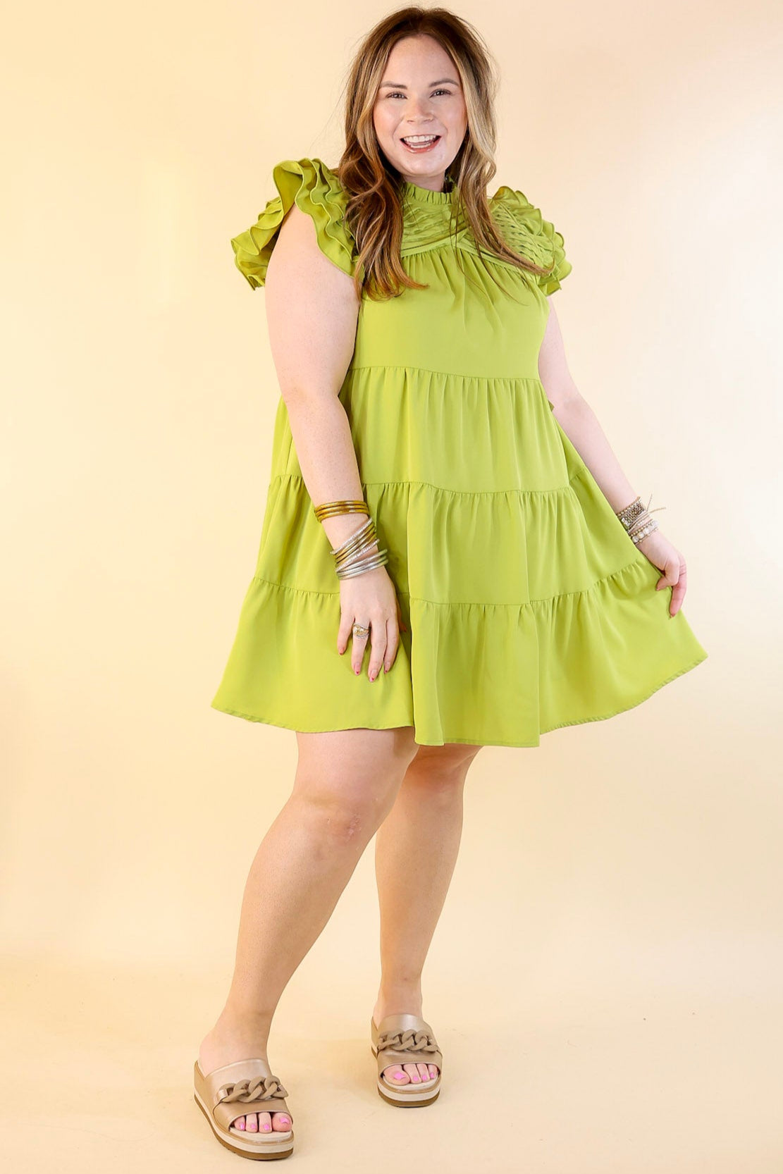 Chic On Scene Ruffle Tiered Dress with Pleated Detailing in Pistachio Green