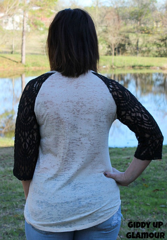 Last Chance Size Small & Medium | Cupids Drive In Baseball Tee with Black Lace Sleeves