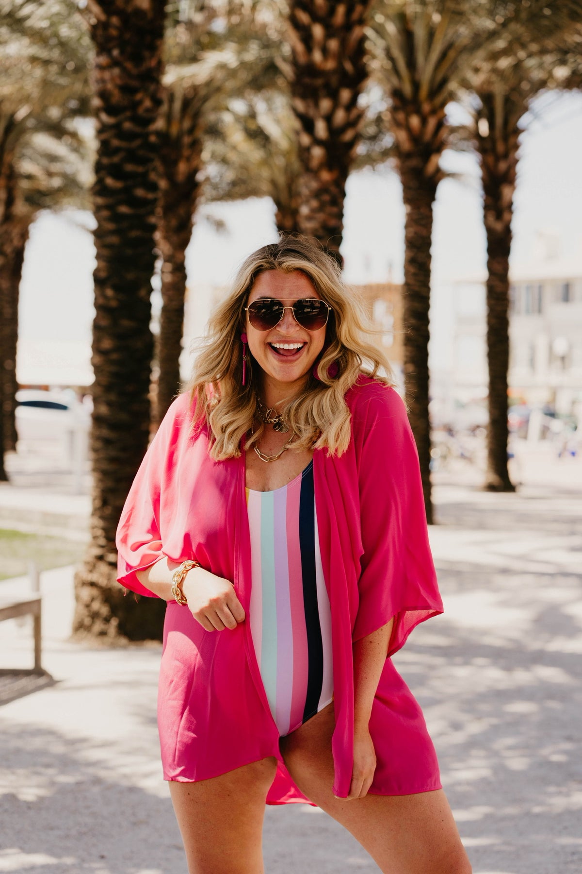 This adorable swimsuit is flirty, sassy, and perfect for the poolside! It includes tank top straps, an open back, and pink vertical stripes. This swimsuit is perfect for making skin look tan and figures look great!